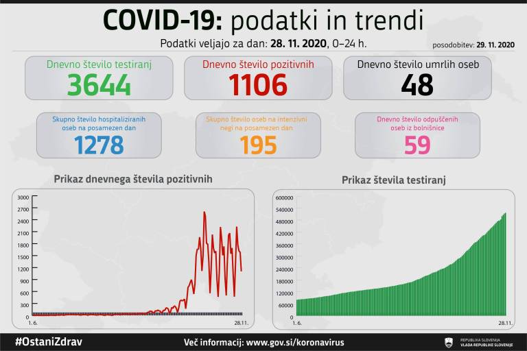 V Sloveniji so v včeraj, 28. novembra, opravili 3644 testiranj na koronavirus in potrdili 1106 novih okužb. To pomeni, da je bil delež pozitivnih testov tokrat 30,35 odstotka.