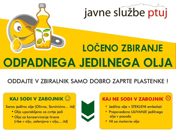 Zabojniki za ločeno zbiranje odpadnih jedilnih olj so postavljeni tudi na območju Mestne občine Ptuj, in sicer pri: Osnovni šoli Ljudski vrt, Osnovni šoli Grajena, trgovini Spar-Rabelčja vas, Osnovni šoli dr. Ljudevita Pivka, Eko otoku na Dravski ulici, Osnovni šoli Breg, Qlandiji.