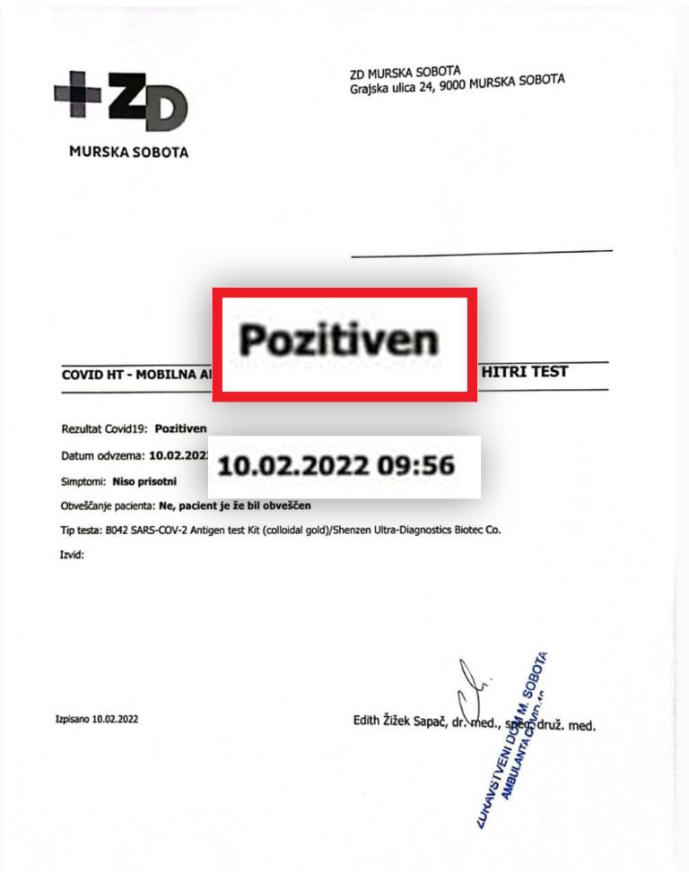 Gospodu, ki mi je v kontejnerju pri Zdravstvenem domu Murska Sobota vzel bris iz nosu, sem razložila, da sem se zjutraj dvakrat samotestirala, rezultat obakrat pozitiven. Nato razlagam, da sem opravila že dva hitra testa pri trgovskih centrih, a v rezultat nisem prepričana, ker so bili brisi odvzeti dokaj slabo.