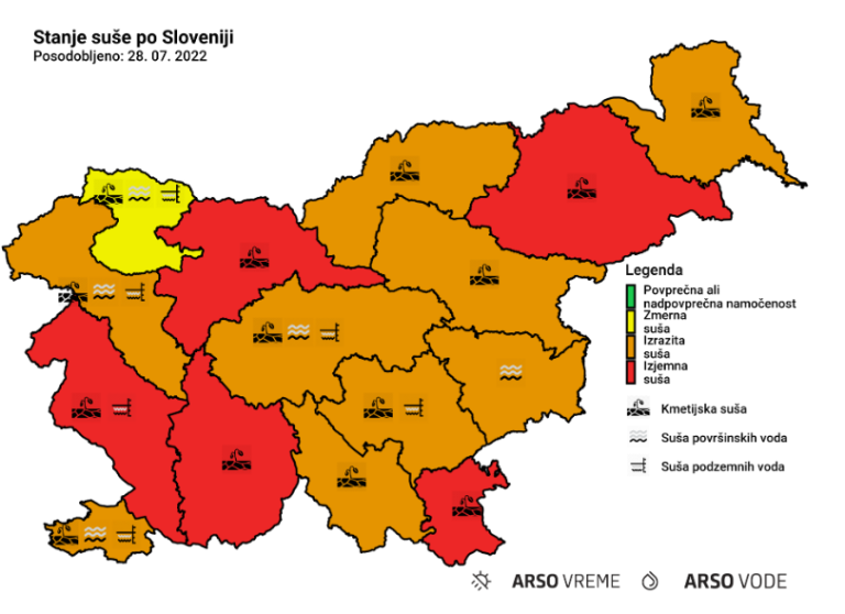 »Padavine so v preteklem sedemdnevnem obdobju le lokalno in za krajši čas nadomestile primanjkljaj vode v površinskem sloju tal. V večjem delu Slovenije so se sušne oziroma vodno bilančne razmere v površinskem sloju tal še nekoliko poslabšale,« so zapisali na svoji spletni strani.