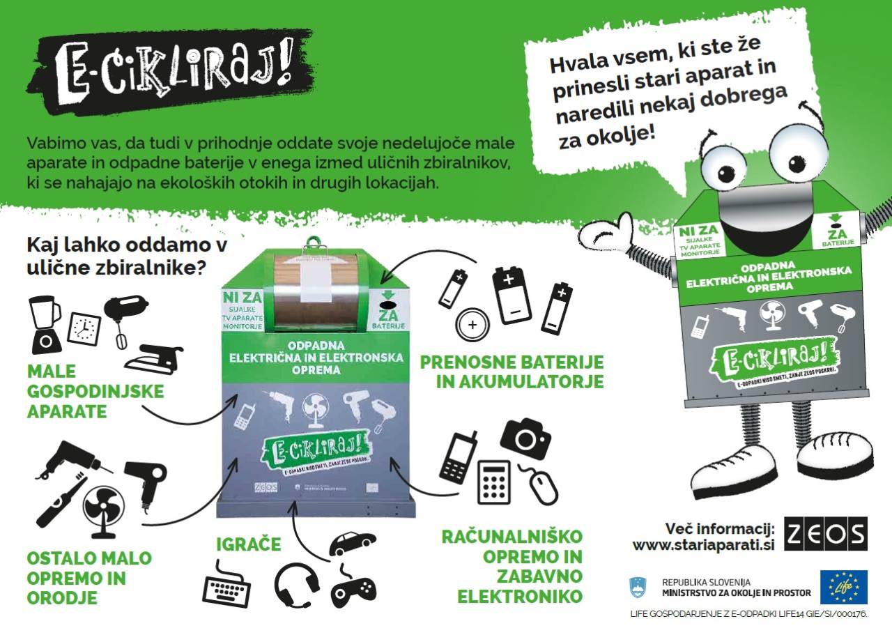Ulični zbiralniki so postavljeni v sklopu projekta Life Gospodarjenje z e-odpadki pod sloganom E-cikliraj. Njihove lokacije lahko najdete na spletnem zemljevidu na www.stariaparati.si.