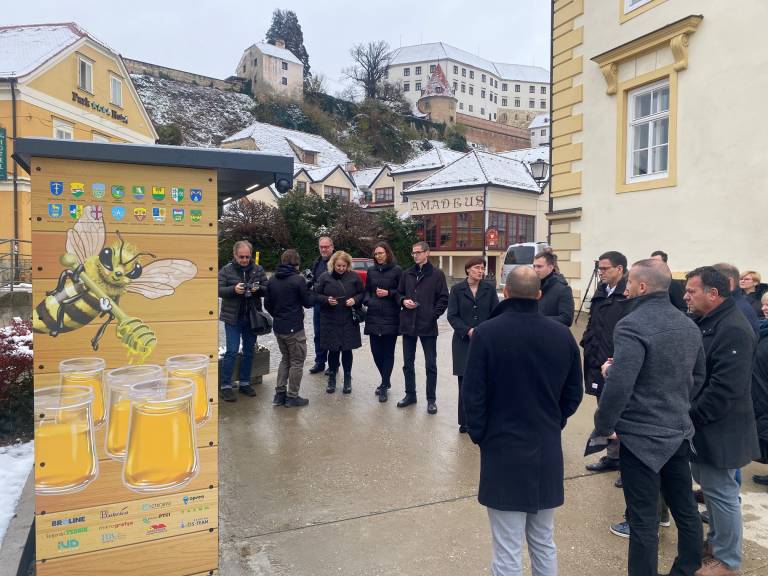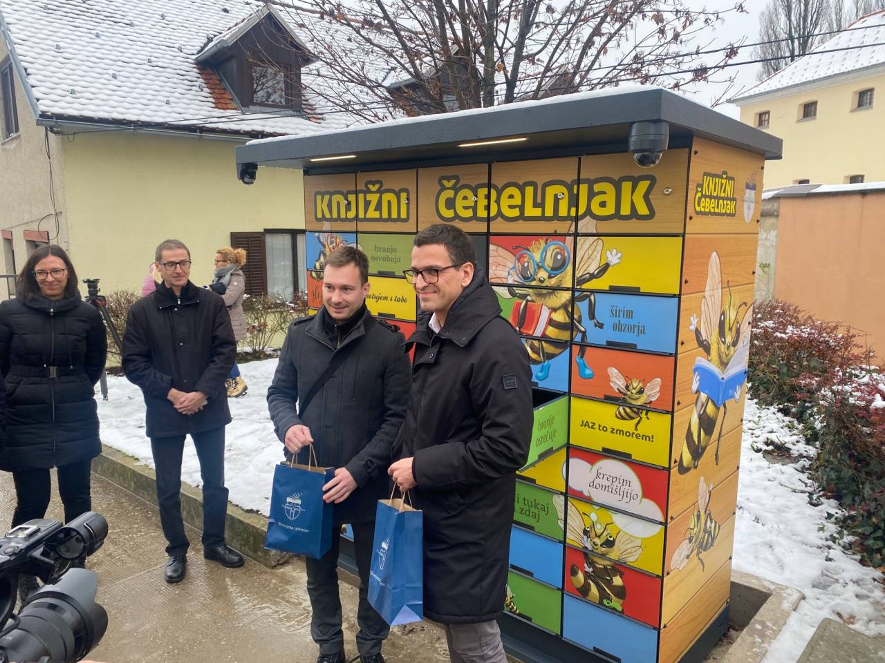 Knjižni čebelnjak ptujske knjižnice so danes predstavili in predali svojemu namenu. Zbrane so nagovorili direktorica Knjižnice Ivana Potrča Ptuj Milena Doberšek, direktor mestne uprave Alen Jevtović in direktor podjetja Tenzor Miha Senčar.