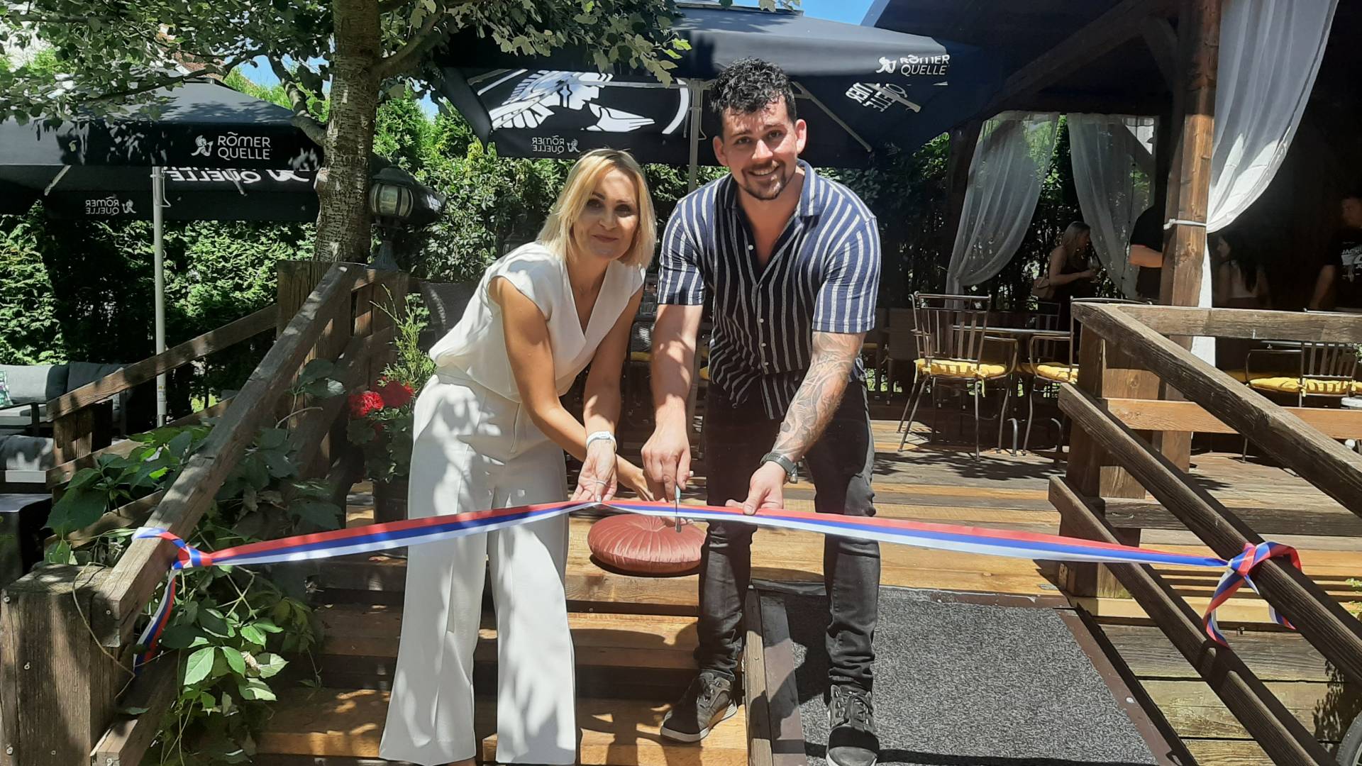 Opoldan sta županja Mestne občine Ptuj Nuška Gajšek in novi najemnik Sladke Kavarne Lük Tadej Zemljič slavnostno prerezala trak in s tem odprla kavarno.