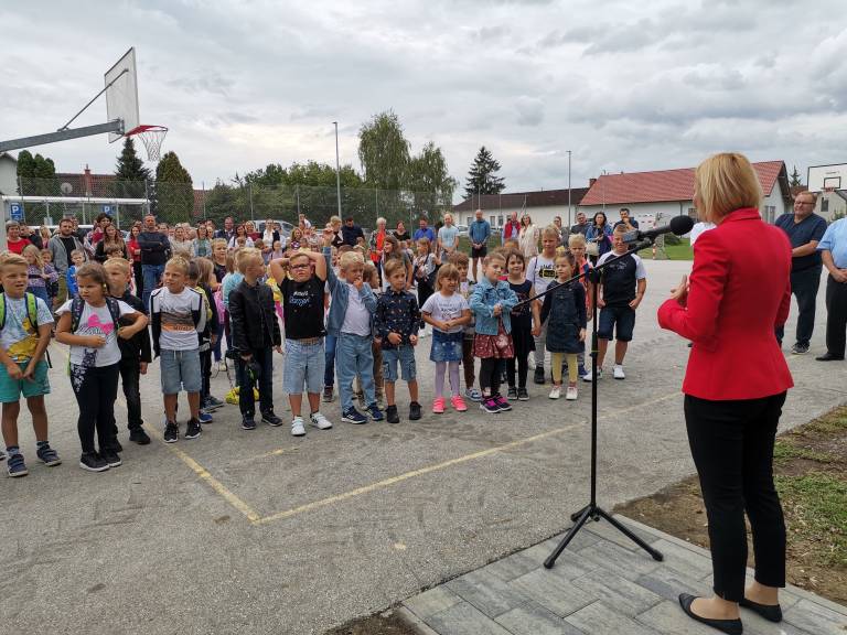 Prvošolčke in otroke, ki svojo breško šolo že poznajo, pa je nagovorila tudi županja Ptuja Nuška Gajšek. Ob učilnici na prostem so sicer tudi igrala, tobogan, tudi trampolin, igralo, ki ga lahko srečamo na zdaj že večini ptujskih igrišč.