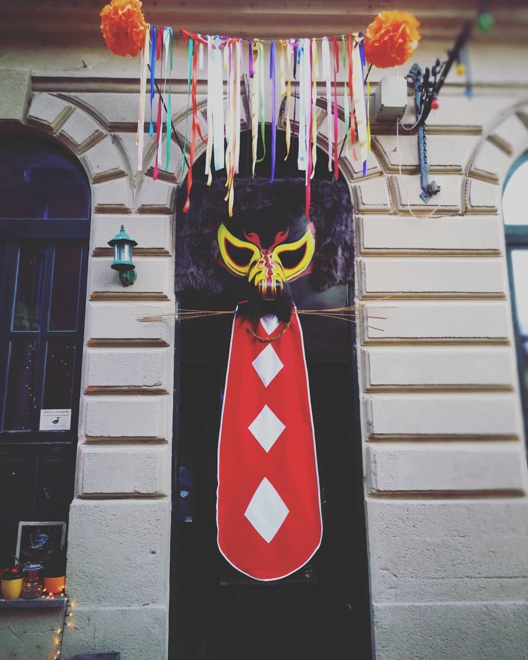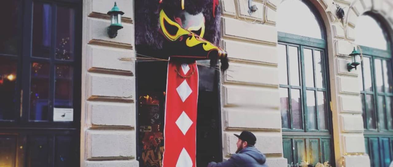 Vhod v Kavarno Bodi zdaj krasi velika kurentova maska. V višino meri okoli 2,30 metra, v širino okoli 1,40 metra, samo kurentov nos je dolg več kot meter.