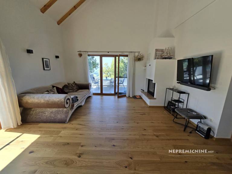 Pritličje ponuja prostorno dnevno sobo s kaminom, veliko kuhinjo z jedilnico in izjemnim panoramskim razgledom, dve spalnici, kopalnico, ločen WC ter dostop do garaže za dva avtomobila. V mansardi je glavna spalnica z garderobama, možno je urediti dodatno sobo.