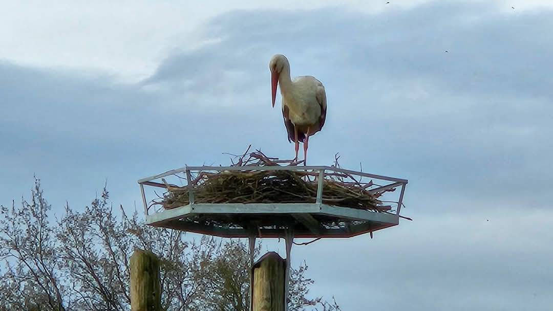 »V nedeljo, 23. marca, se je štorklja vrnila in najprej pristala na umetnem gnezdu, nato pa poletela na staro lokacijo in poskušala odstraniti palice, ki preprečujejo gradnjo. Na koncu je obupala.«