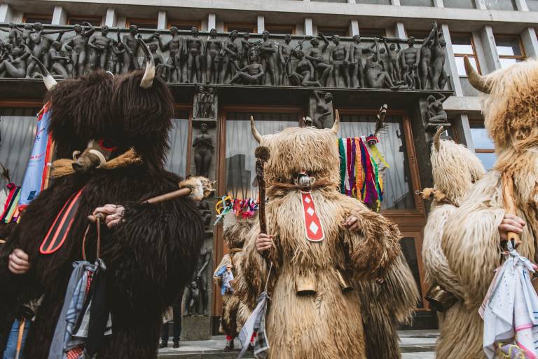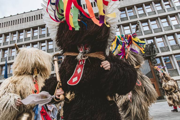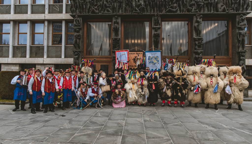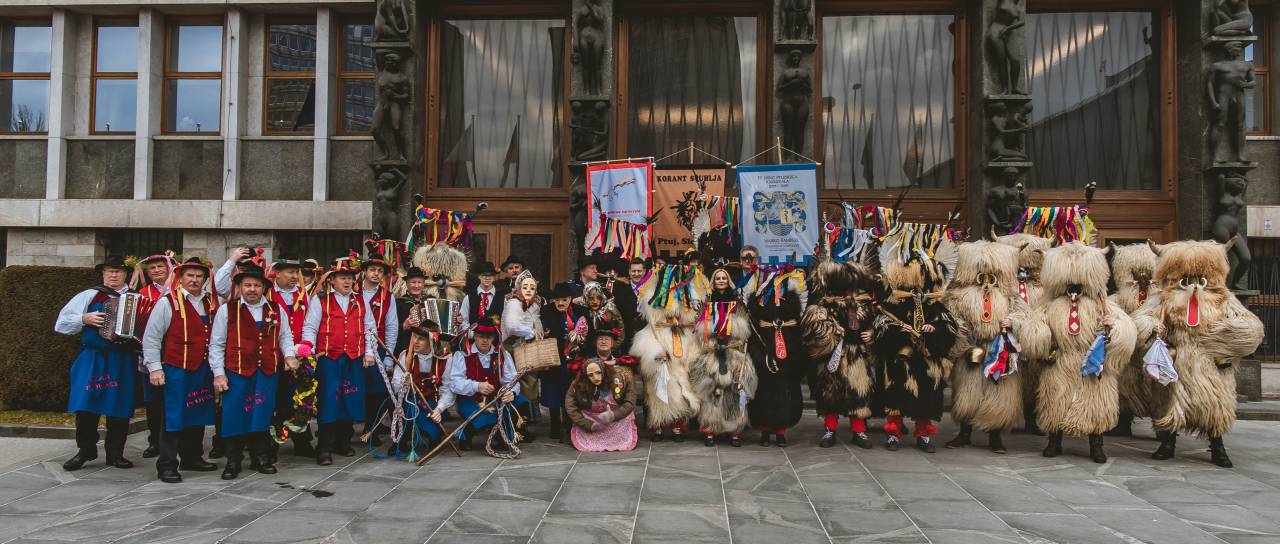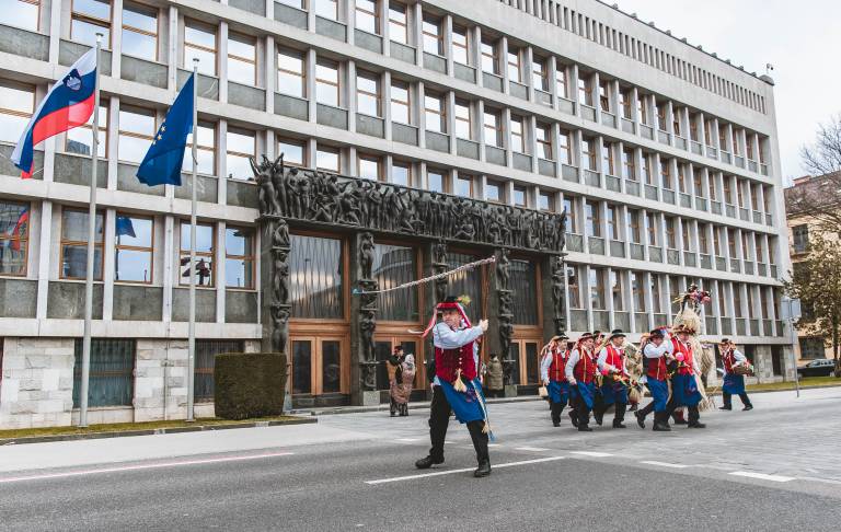 Med pustnimi liki, ki so prišli pred državni zbor, so bili kurenti ter tradicionalni liki baba deda nosi, gospodinja, pobirač, pokač in konji, spremljal pa jih je harmonikar.