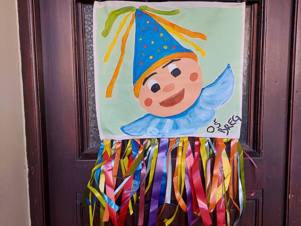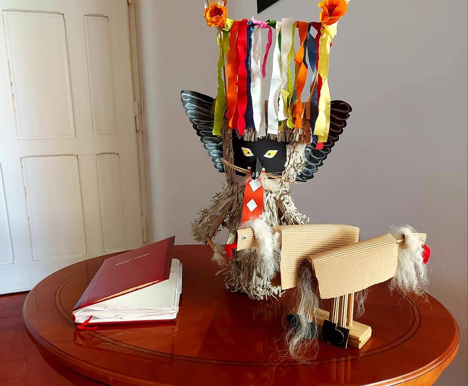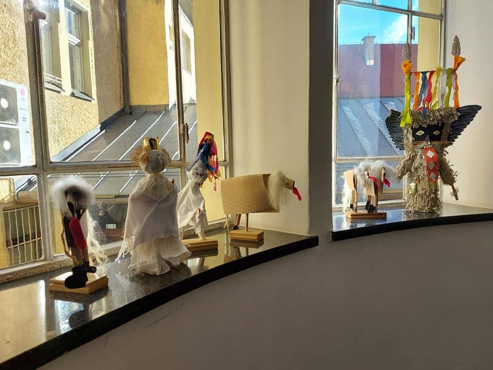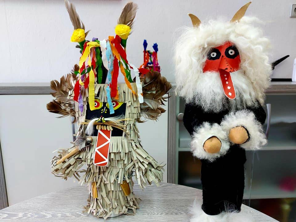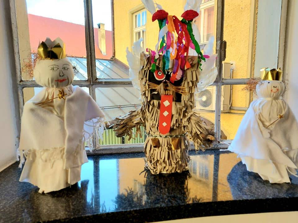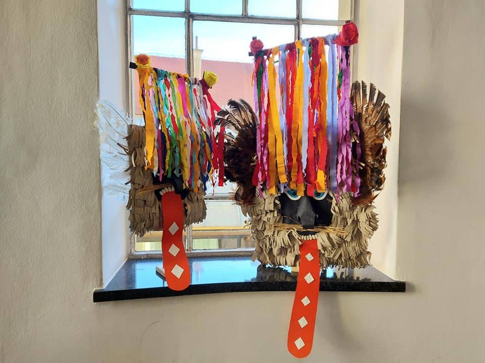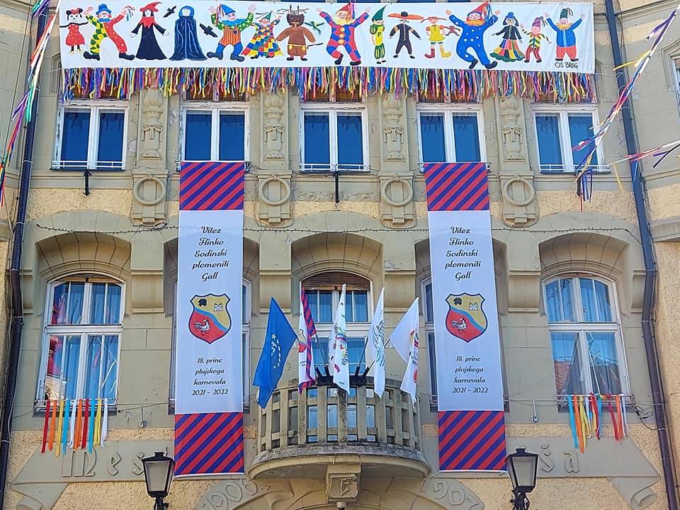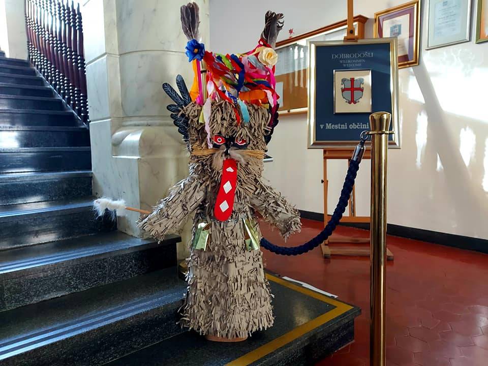 Mestno hišo tako krasijo pisane risbe, notranjost pa miniaturni kurenti in druge pustne maškare, ki so nastale izpod rok osnovnošolcev.