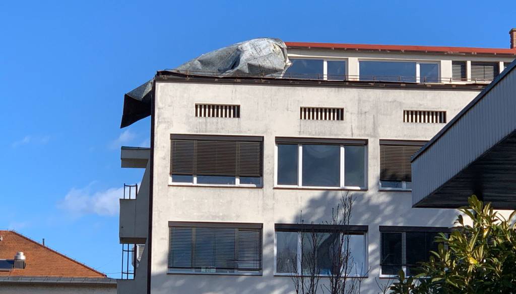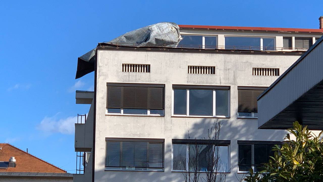 S ptujske bolnišnice veter odtrgal del pločevinaste strehe