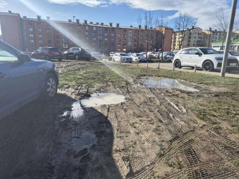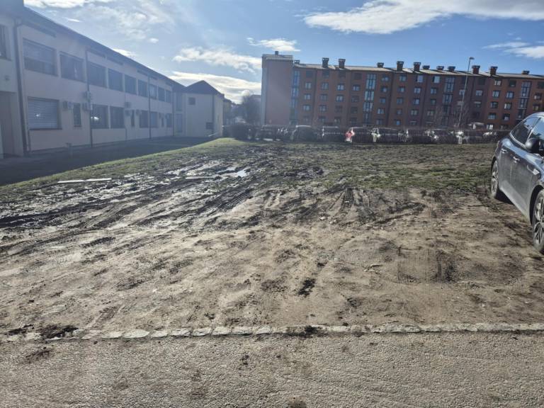 Travnata površina je zdaj, po daljšem obdobju parkiranja na njej, precej uničena, v času padavin, pa je na tem območju polno luž in blata.