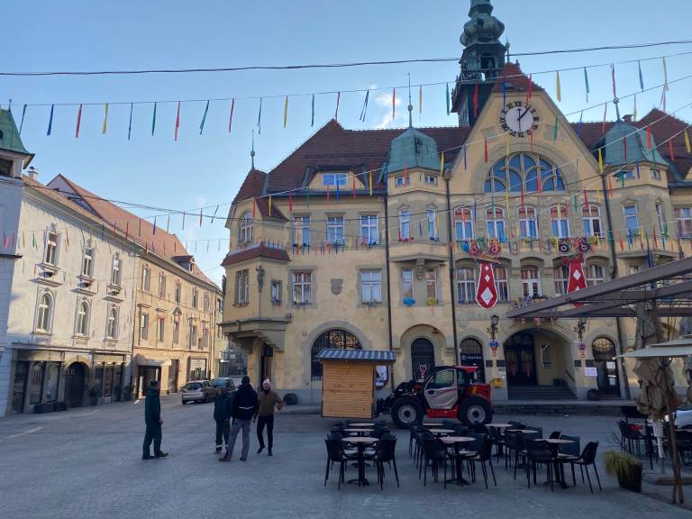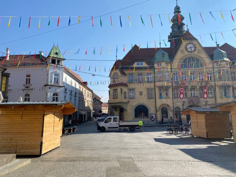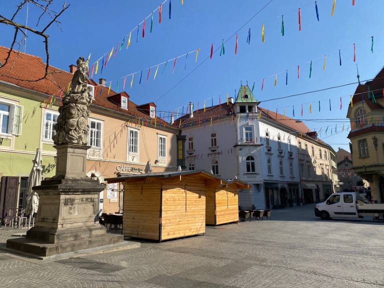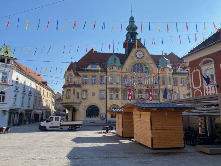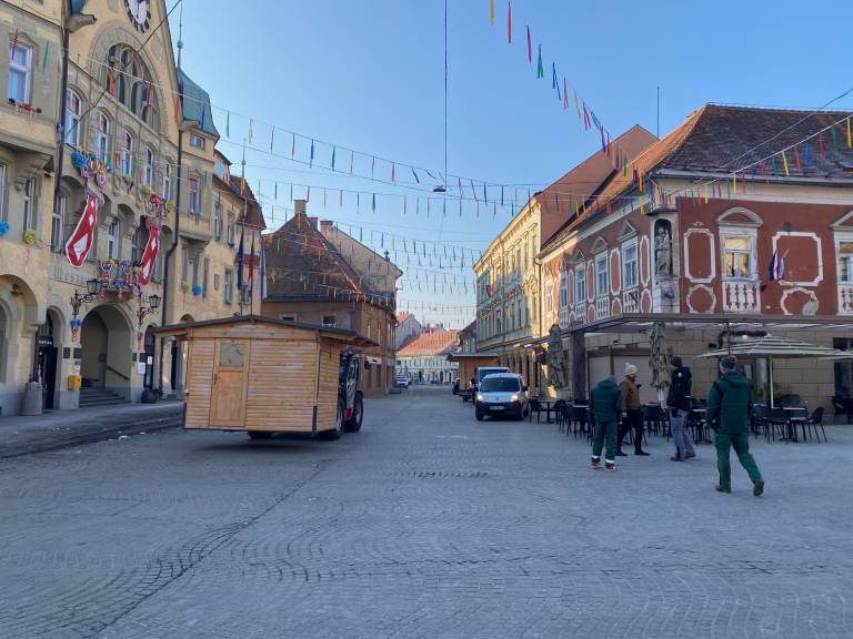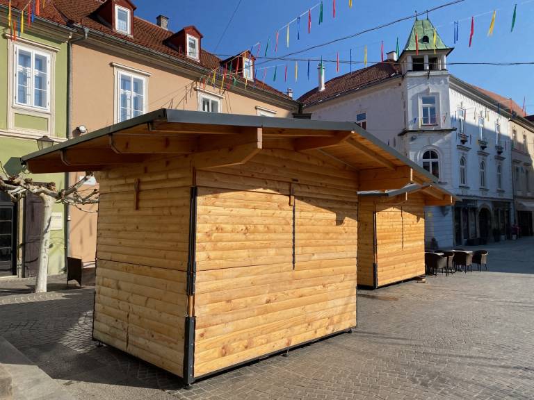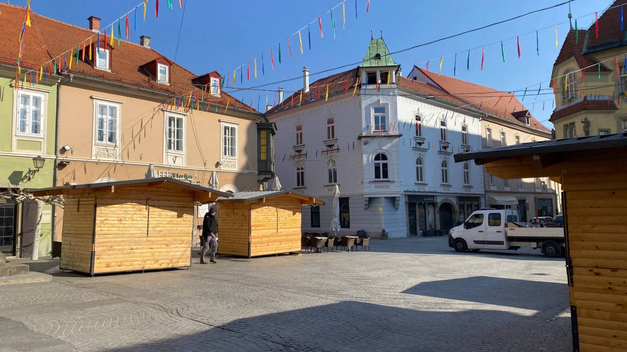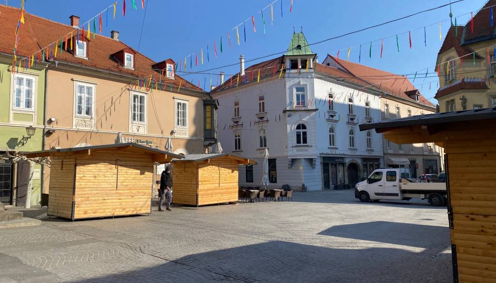Delavci Javnih služb Ptuj so danes na Mestni trg pripeljali štiri hiške, v katerih bo gostinska ponudba in eno hiško, ki bo imela sladko ponudbo, kot so kokice in sladkorna pena.