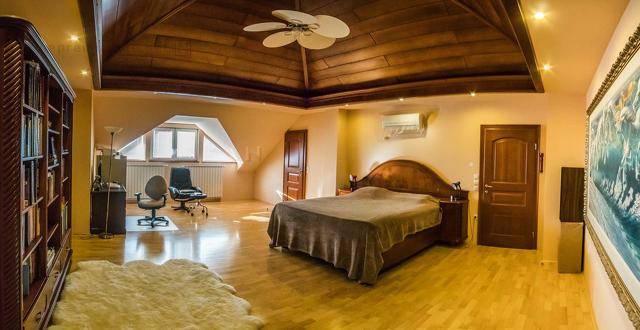 V zgornjem nadstropju se nahaja velik odprt prostor, kjer je urejena hišna pisarna in dnevni prostor ter velika terasa. V nadstropju sta prav tako dve veliki spalni sobi in kopalnica s kadjo in tušem.