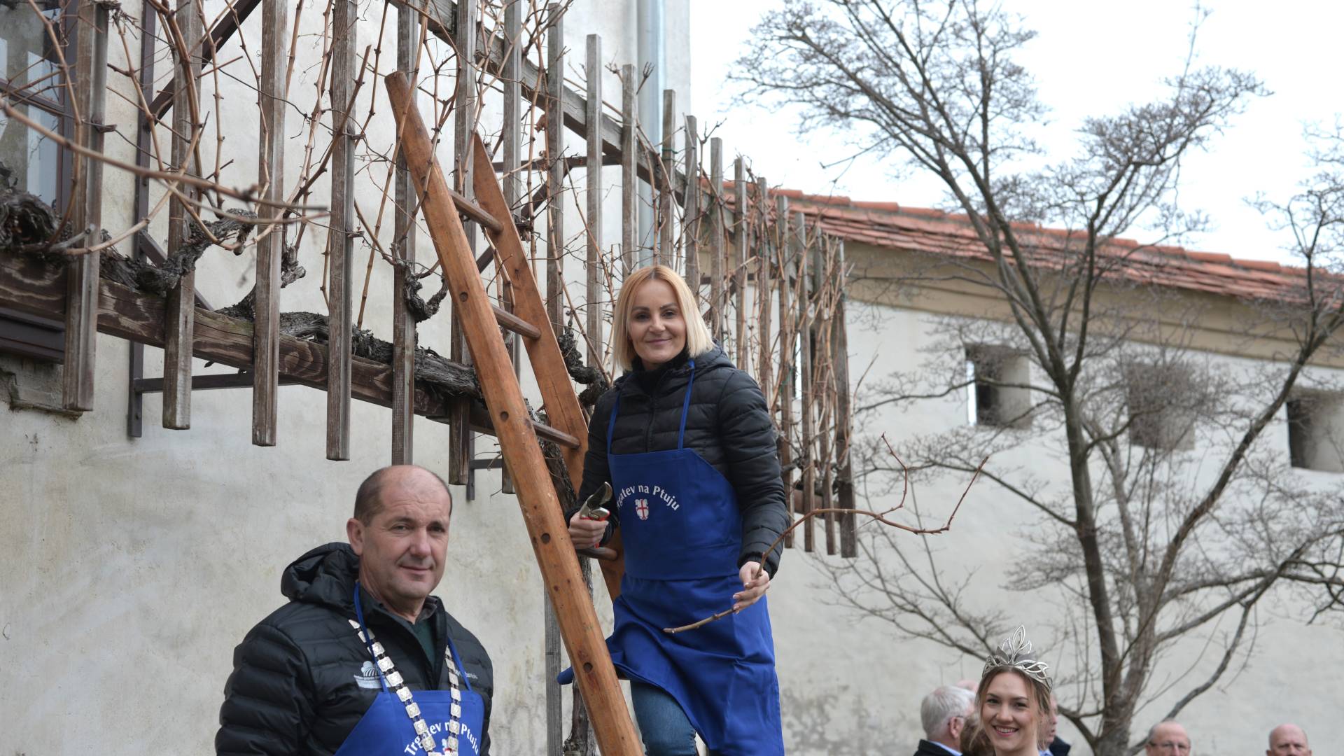 Po nagovoru županje Mestne občine Ptuj Nuške Gajšek, mestnega viničarja Andreja Reberniška in ptujske vinske kraljice Lucije Kramer so se slednji povzpeli na lestev in pred občinstvom opravili slavnostni rez potomke najstarejše trte na svetu.