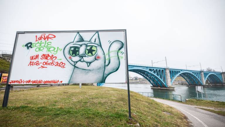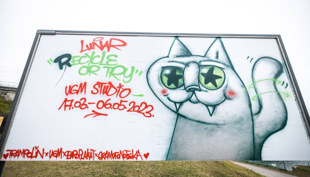 Grafiti napovedujejo Lunarjevo razstavo Recycle or try (Recikliraj ali poizkusi), ki bo otvoritev doživela 17. marca.