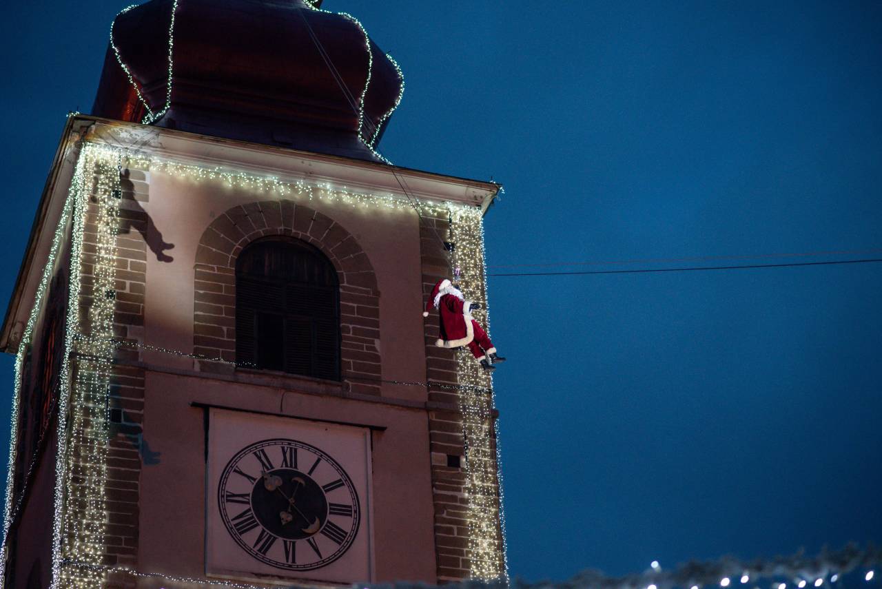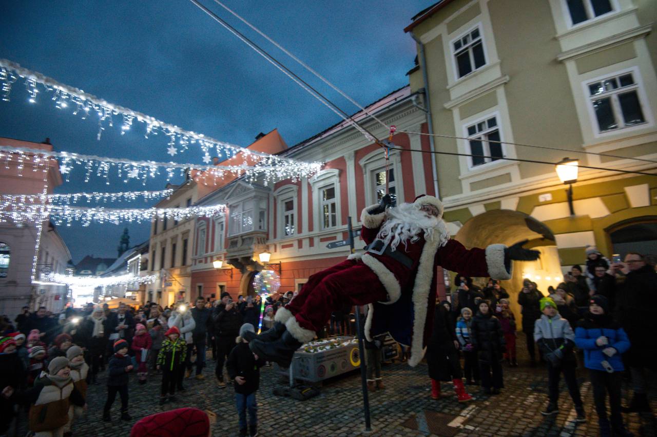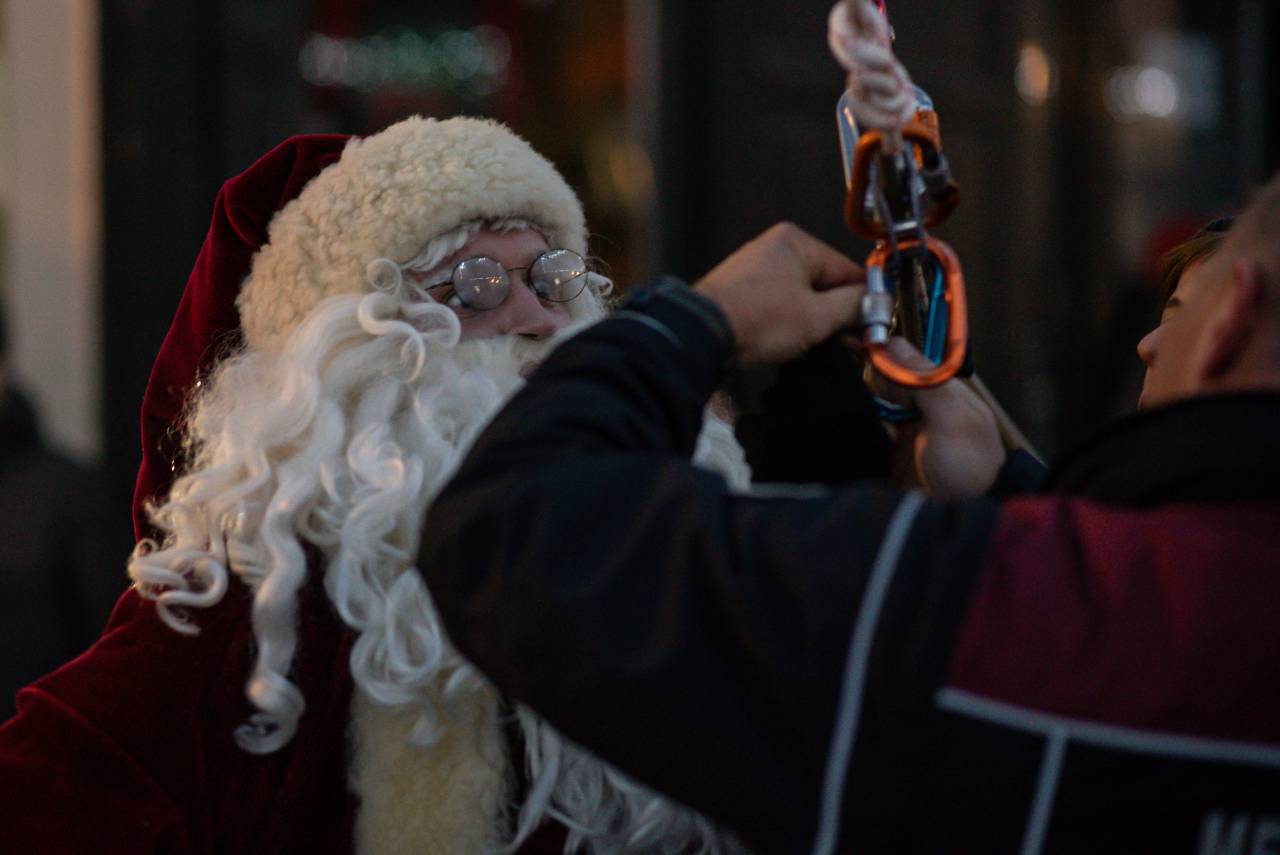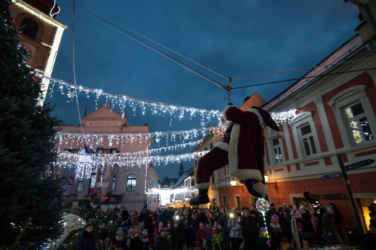 Na Slovenskem trgu se je danes odvil pravi spektakel. Božiček se je v mesto spustil kar z zvonika mestnega stolpa.