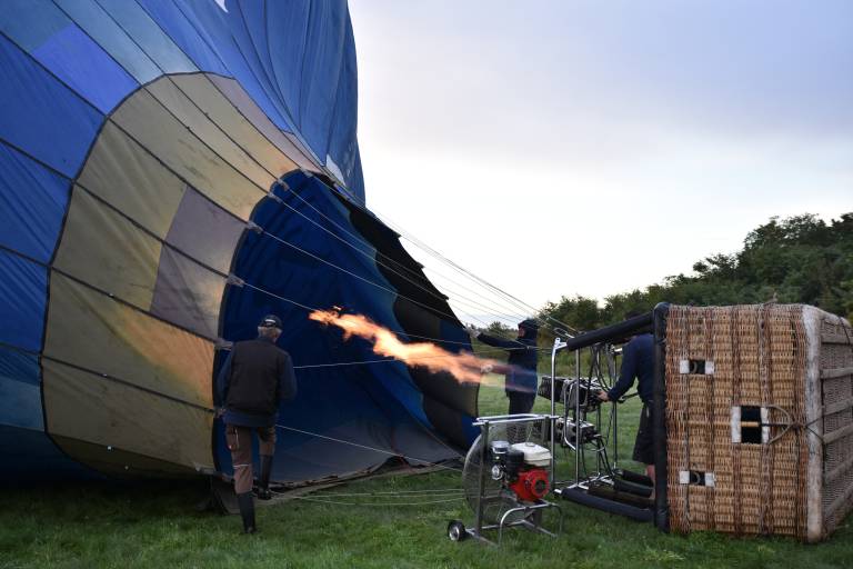 Balonarska ekipa na soboškem letališču najprej razgrne balon in ga razpre s plinom ter postavi košaro, nato sledi ekspresno vkrcanje posadke in varnostni napotki.