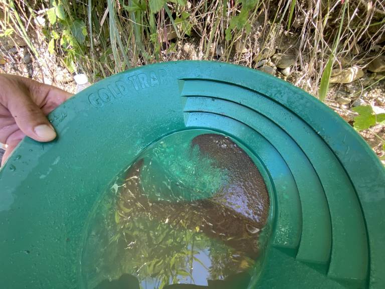 Iskanje zlata je dolgotrajen postopek, ki zahteva fizično moč, predvsem pa potrpežljivost. Material se z lopatami nalaga na doma narejeno napravo, kjer voda spira material.