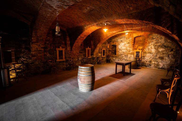 Pot mimo topa pa nadaljujemo na drugo stran hiše, do kleti. Obokana, z visokimi stropi, se uporablja za degustacije.
