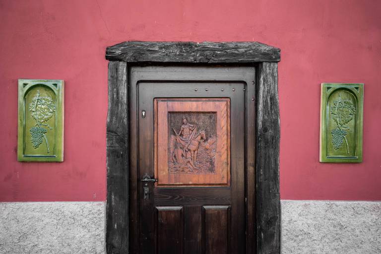 Na zidovih visijo fotografije, ki so bile posnete nedaleč stran od krčme. Umetnost, ki priča o oblačilih, ki so jih nosili takrat, o izgledu vinogradov, katerih trte so rasle navzgor. Tak vinograd krasi tudi dvorišče krčme, raste navzgor kot fižol.