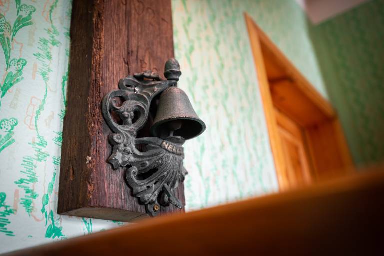 Ob šanku pogled pritegne tudi leseni steber, na katerega je pritrjen zvonček. Leseni del je stranica 'prešpana', dela stiskalnice grozdja. Na stranici pa je izdolben napis.
