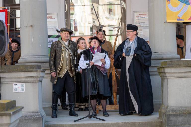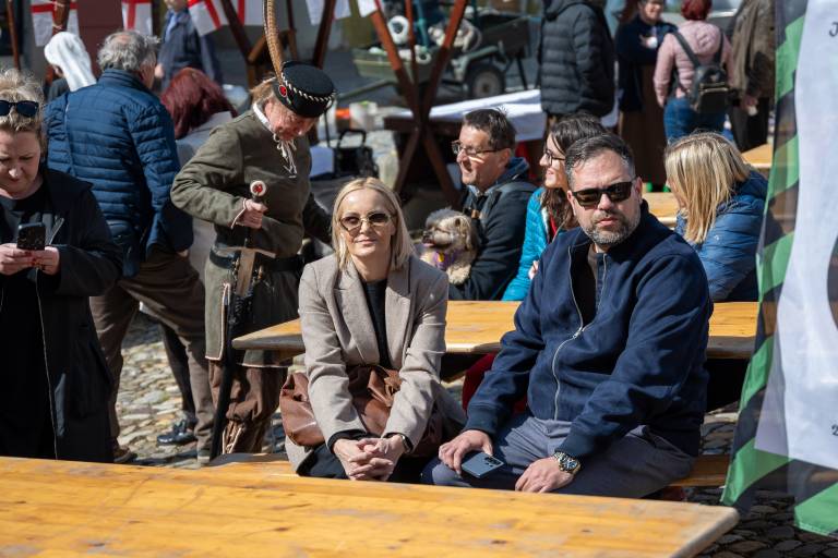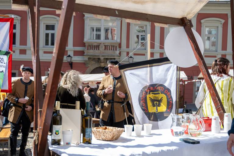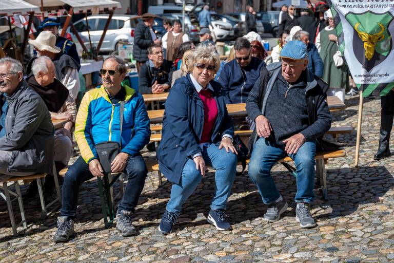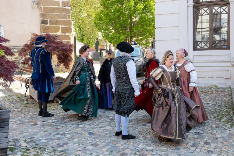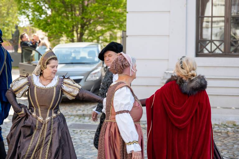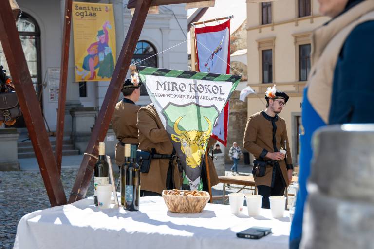 Po trgu se sprehajajo številni zgodovinski liki - od plemstva in meščanov do vitezov in beračev, ki skupaj ustvarjajo pristno vzdušje.