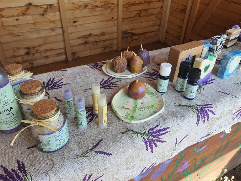 Poleg teh dveh izdelkov je nastala tudi aromaterapevtska svečka iz lastnega eteričnega olja sivke in čebeljega voska projektnega partnerja na ročno izdelanem keramičnem podstavku, ki se po uporabi nameni za odišavljanje prostora.