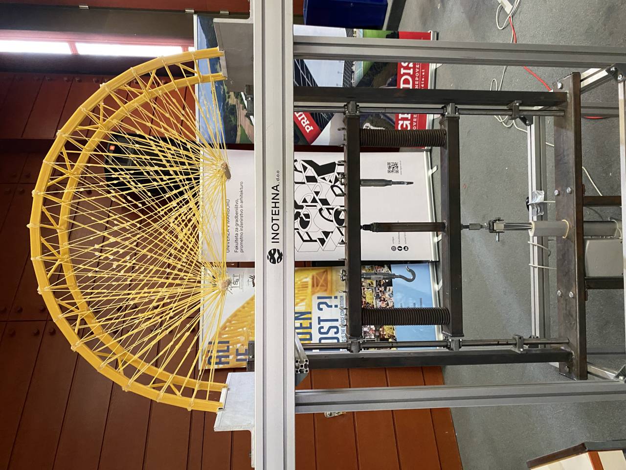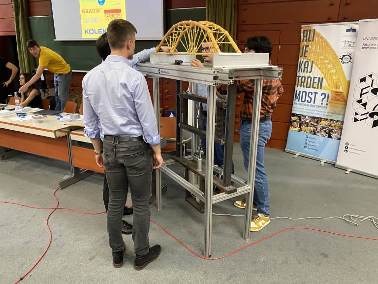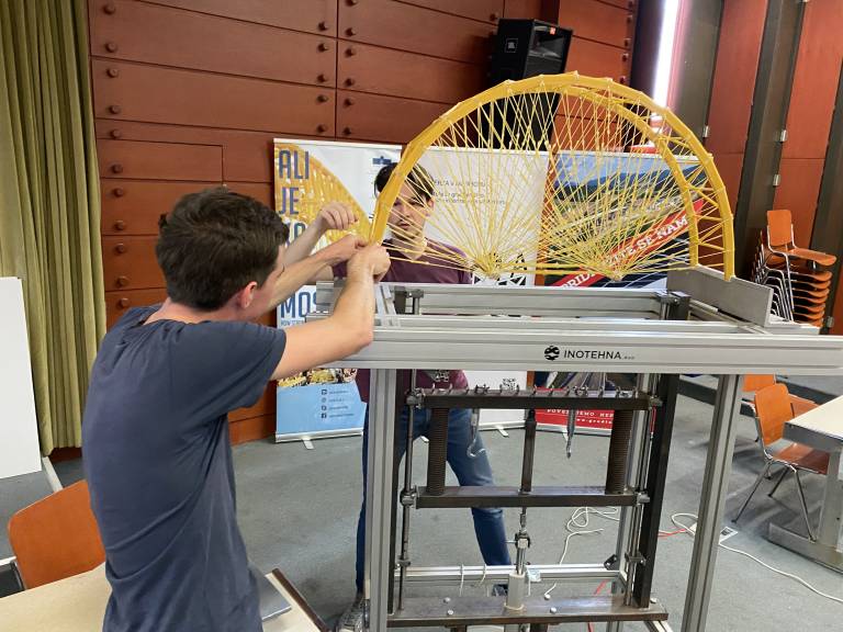 »Sprva jih prinesejo tu na tehtnico, kjer se mostovi stehtajo, potem pa ga ekipe same postavijo na napravo, ga obremenimo in se ga potem zruši,« razlaga postopek Premrov.