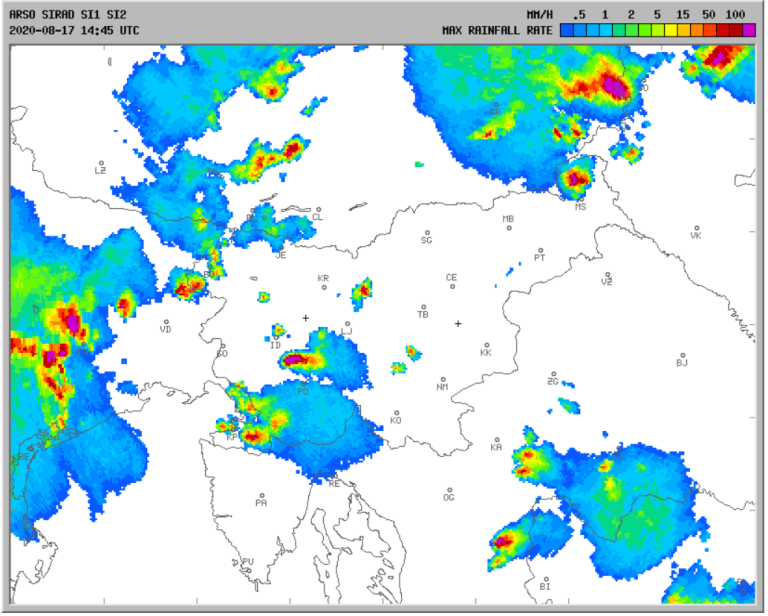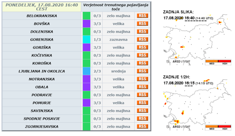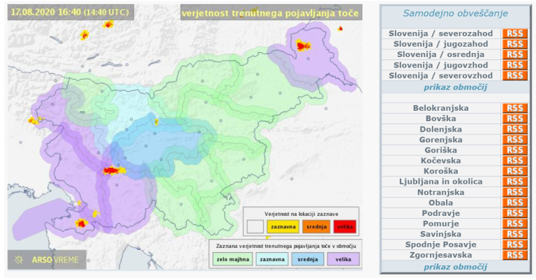 Po podatkih Agencije Republike Slovenije za okolje bodo danes popoldne in zvečer nastale krajevne nevihte, ki se lahko ponekod nadaljujejo tudi v noč. Za območje Pomurja je trenutno razglašen vijoličast alarm, kar pomeni, da je verjetnost pojava toče zelo velika.