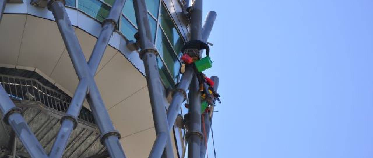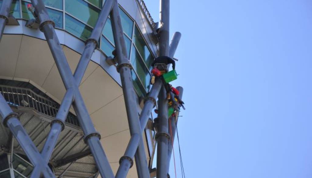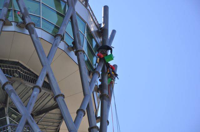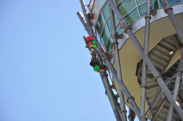 Čiščenje je potekalo tako, da so delavci pripeti z vrvmi in opremljeni s pripomočki za čiščenje viseli s ploščadi stolpa. Delo jim je oteževal še močan veter, ki je pihal tiste dni.