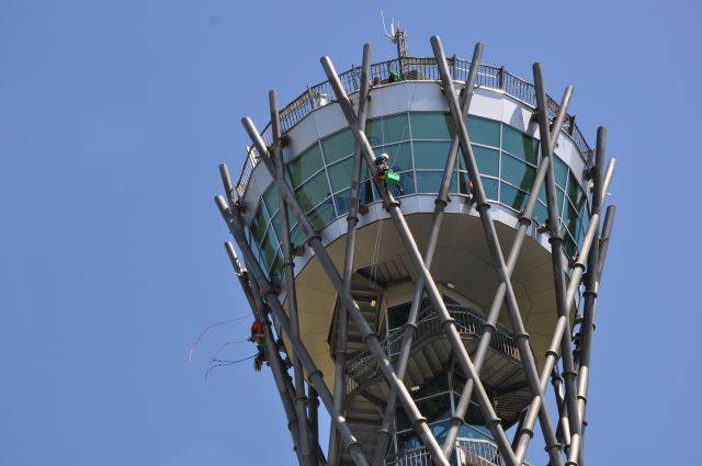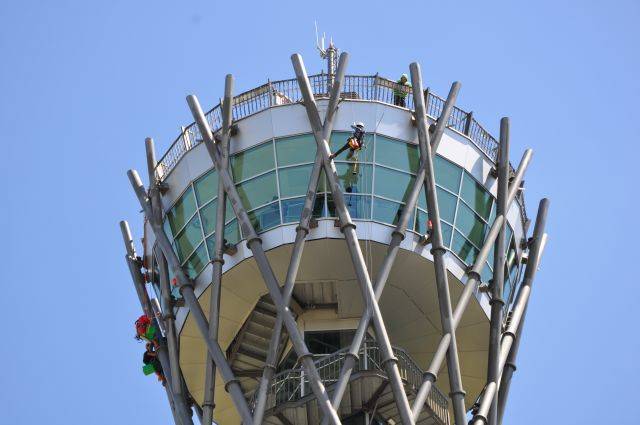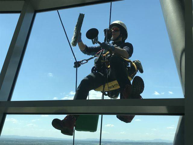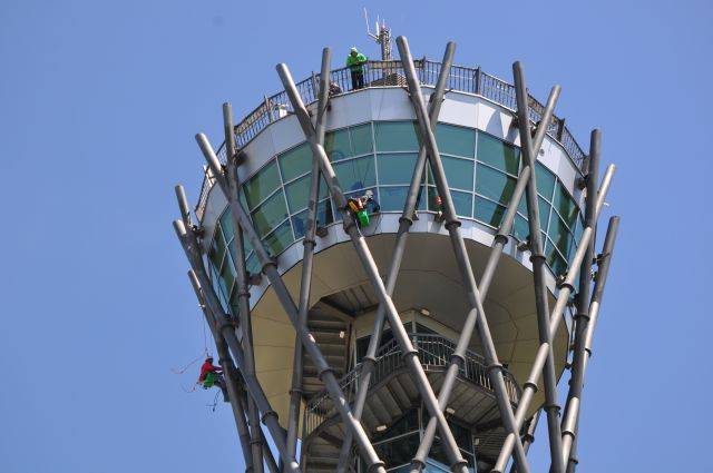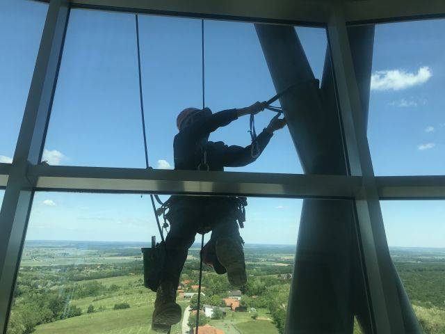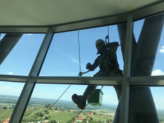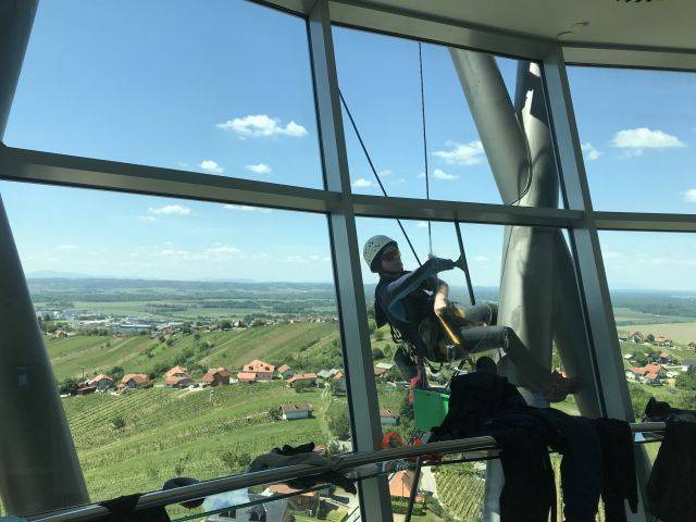 Za čiščenje zunanjih steklenih površin razglednega stolpa Vinarium v Lendavi je potrebnega kar nekaj poguma.