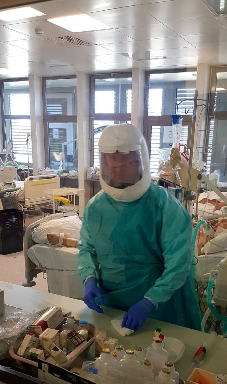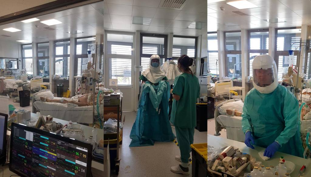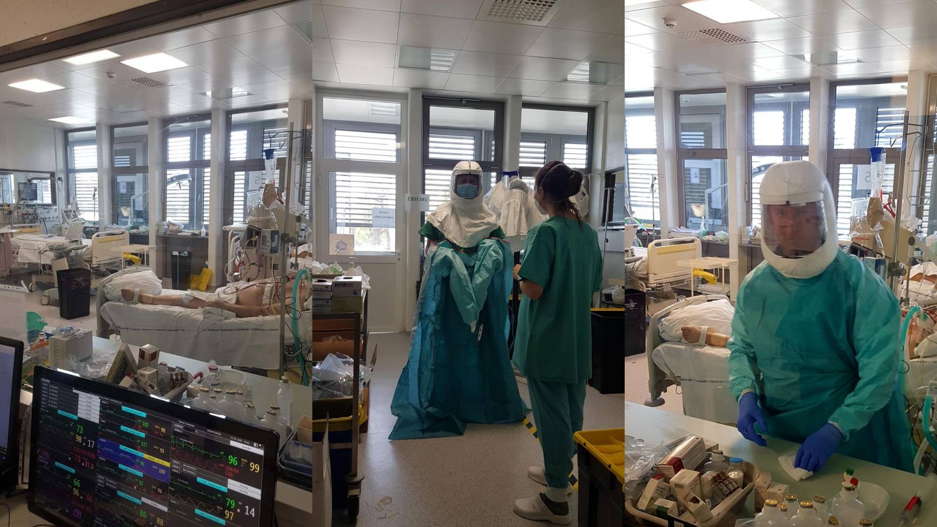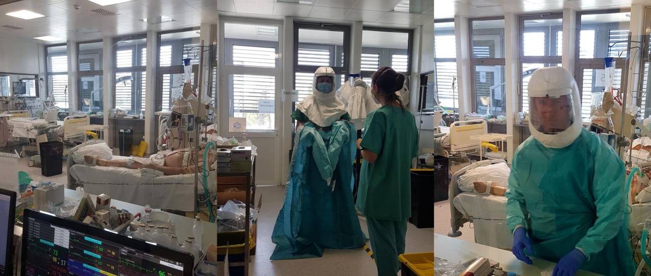 Ob delu z bolniki z covid-19 nosijo skafandre, ki imajo na hrbtu pritrjeno enoto, ki vpihuje zrak v čelado. V tej opremi so velikokrat več ur hkrati. Opremo morajo znati pravilno obleči, še bolj pomembno pa pravilno sleči.