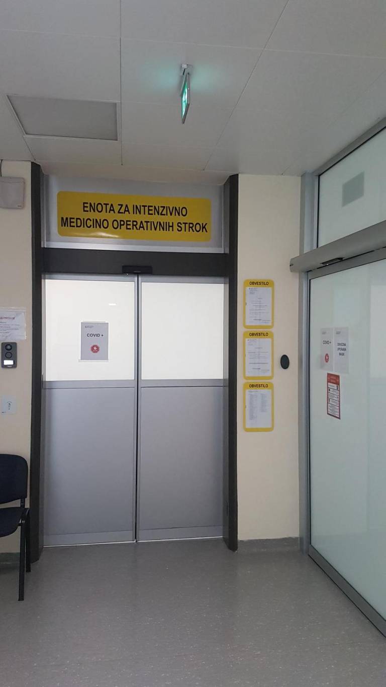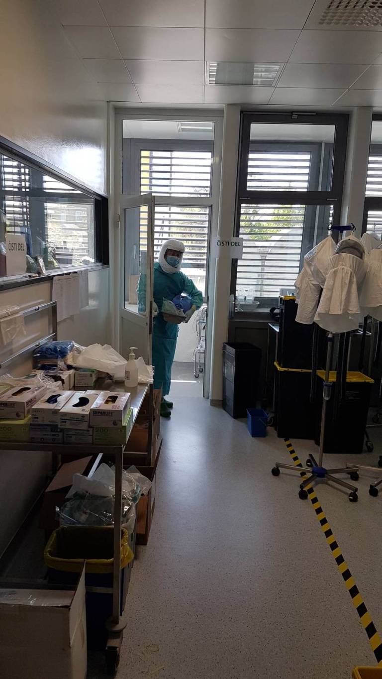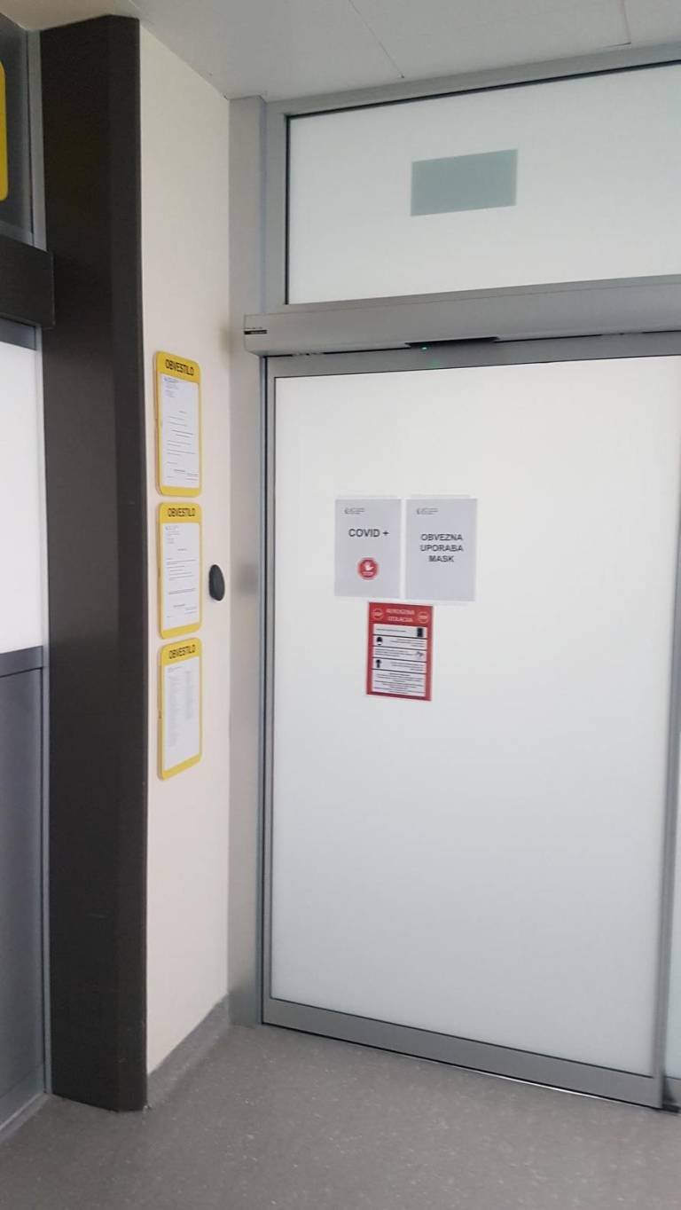Bolniške sobe, v katerih zdravijo covid-19 bolnike, so nekoliko improvizirane, priznavajo: »Nimamo podtlaka, ne nadtlaka ali ostalih pogojev, ki bi jih intenzivna infekcijska potrebovala, zato smo improvizirali tako, da so naša vrata zalepljena s trakovi. Skozi ta vrata vstopamo samo, ko bolnika pripeljemo notri ali ga peljemo na neizbežne preiskave, o katerih prej dobro razmislimo. Vstopamo z vso opremo, skozi filter.«