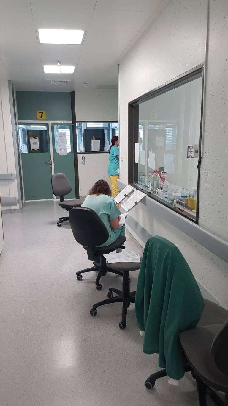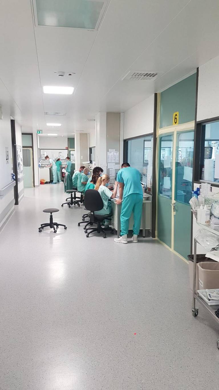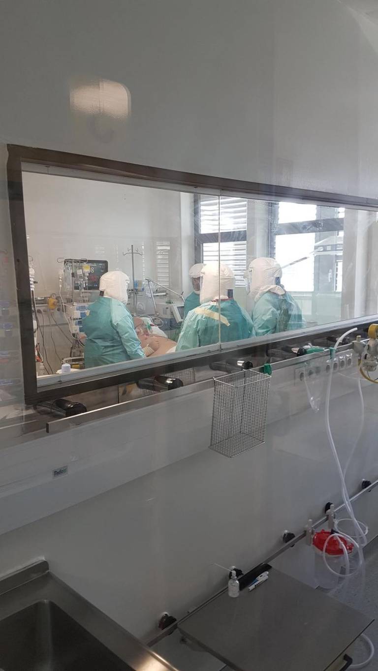 Bolniške sobe, v katerih zdravijo covid-19 bolnike, so nekoliko improvizirane, priznavajo: »Nimamo podtlaka, ne nadtlaka ali ostalih pogojev, ki bi jih intenzivna infekcijska potrebovala, zato smo improvizirali tako, da so naša vrata zalepljena s trakovi. Skozi ta vrata vstopamo samo, ko bolnika pripeljemo notri ali ga peljemo na neizbežne preiskave, o katerih prej dobro razmislimo. Vstopamo z vso opremo, skozi filter.«