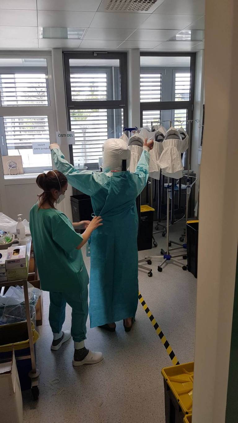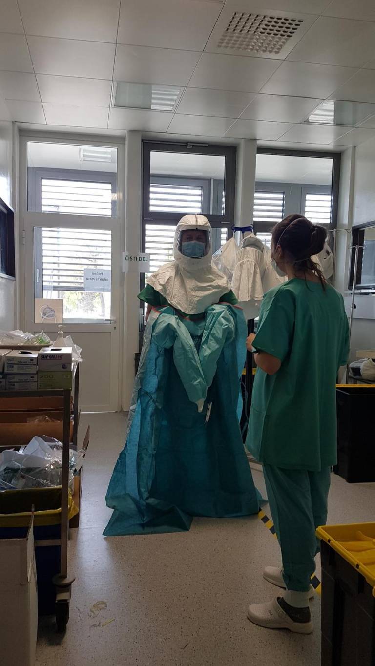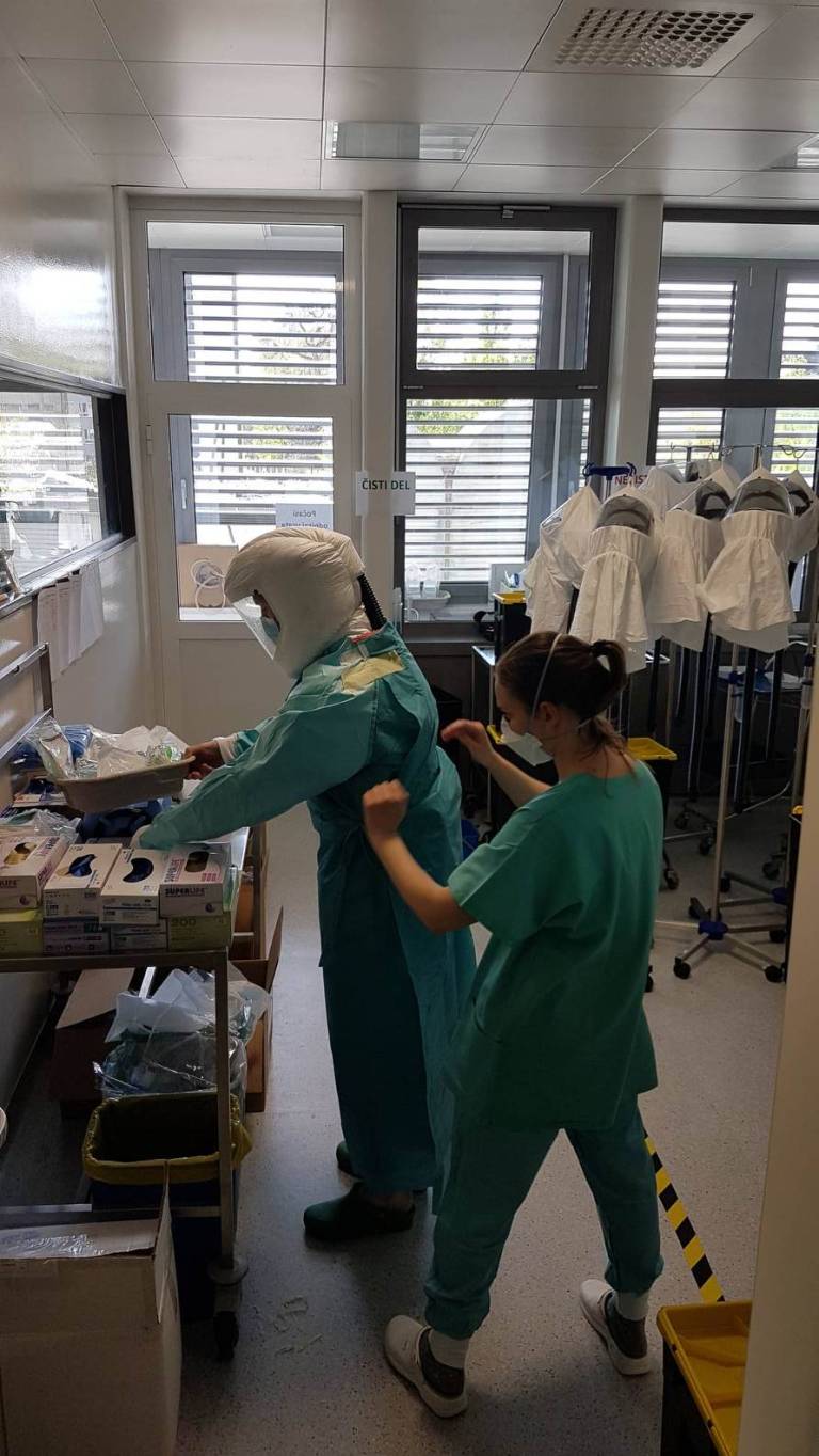 »Delo v zaščitni opremi je naporno, ker nosimo več plasti. Moramo razmišljati, kako se bomo oblekli, kako se bomo slekli, vroče je, ne moremo piti, ne moremo iti na stranišče. Pri slačenju morata biti dva prisotna, eden se slači, drugi kontrolira. Vse skupaj vzame veliko časa,« še dodaja Balažičeva.