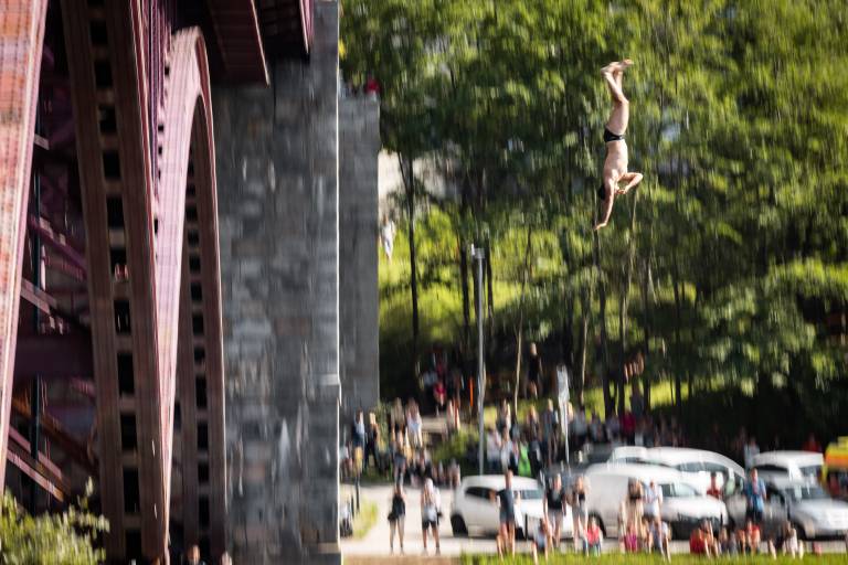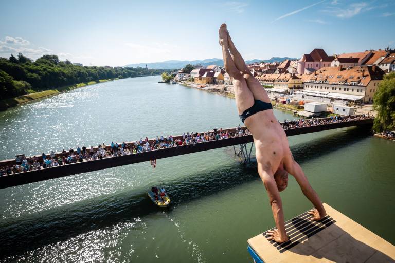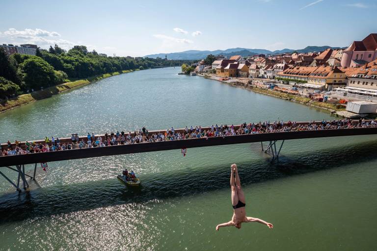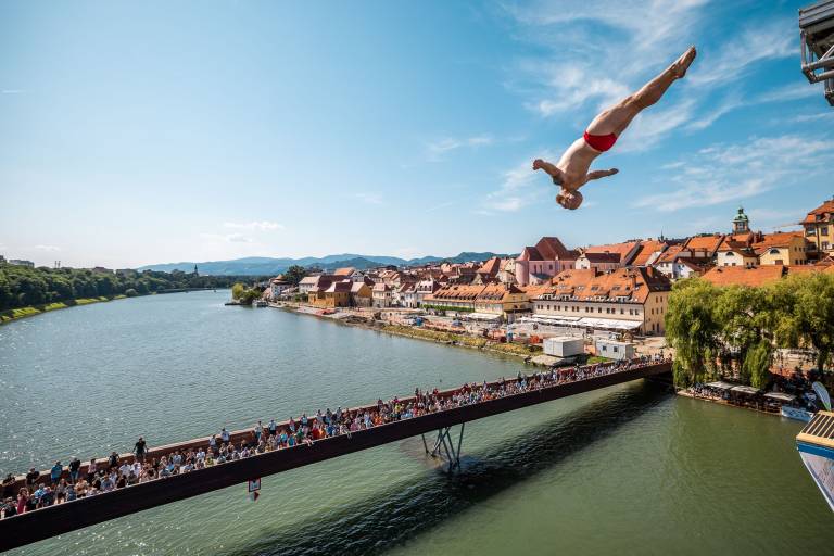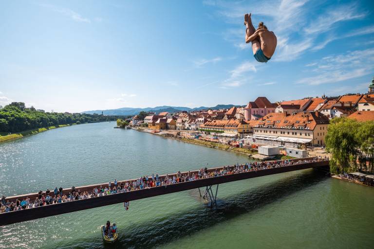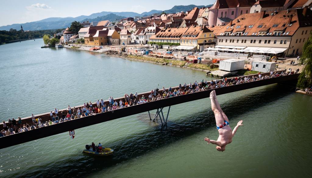 Dogajanje v Mariboru so danes popestrili pogumni akrobati, ki so v okviru že 23. mednarodnega tekmovanja skakali iz Glavnega mostu v Dravo.