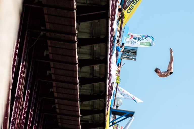 Maribor je bil danes v znamenju ene največjih poletnih atrakcij, saj so najbolj pogumni z Glavnega mostu že 23. skakali v reko Dravo.