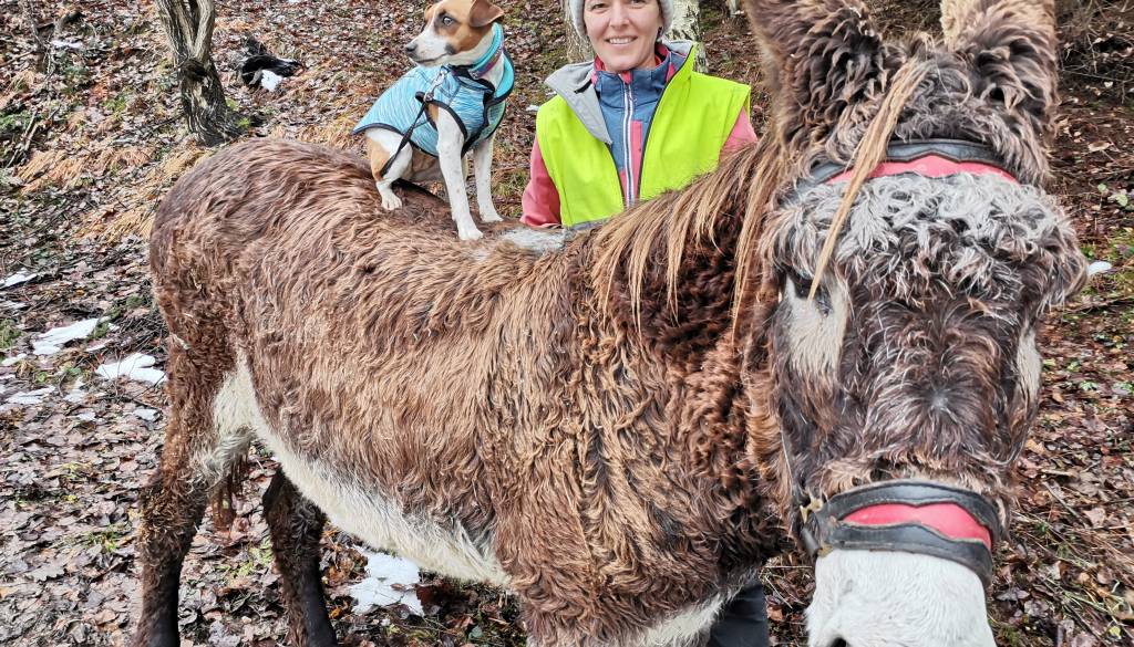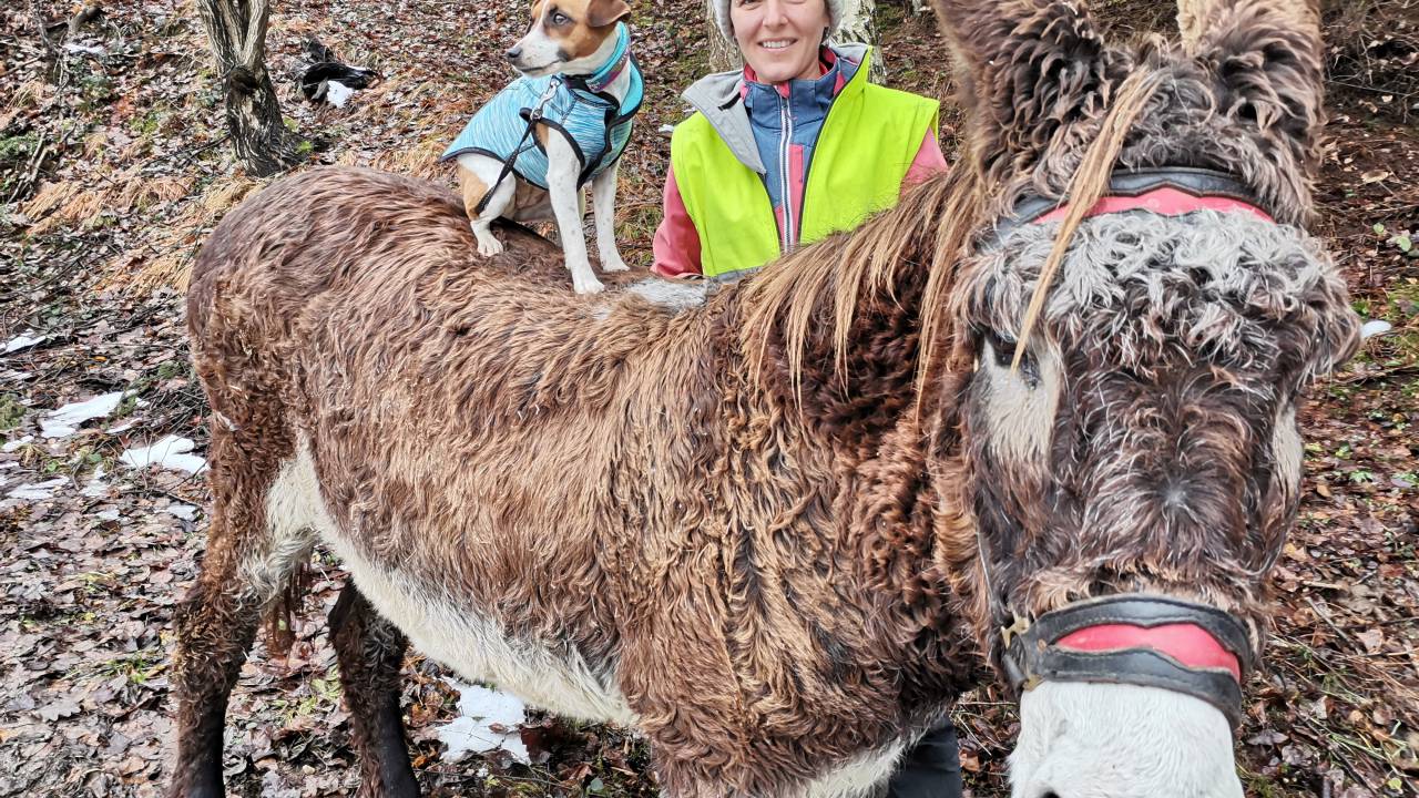 Cindy nadaljuje, da je osel dober čuvaj, saj na poti odganja tudi druge pse, ki bi se preveč približali psički Mini.
