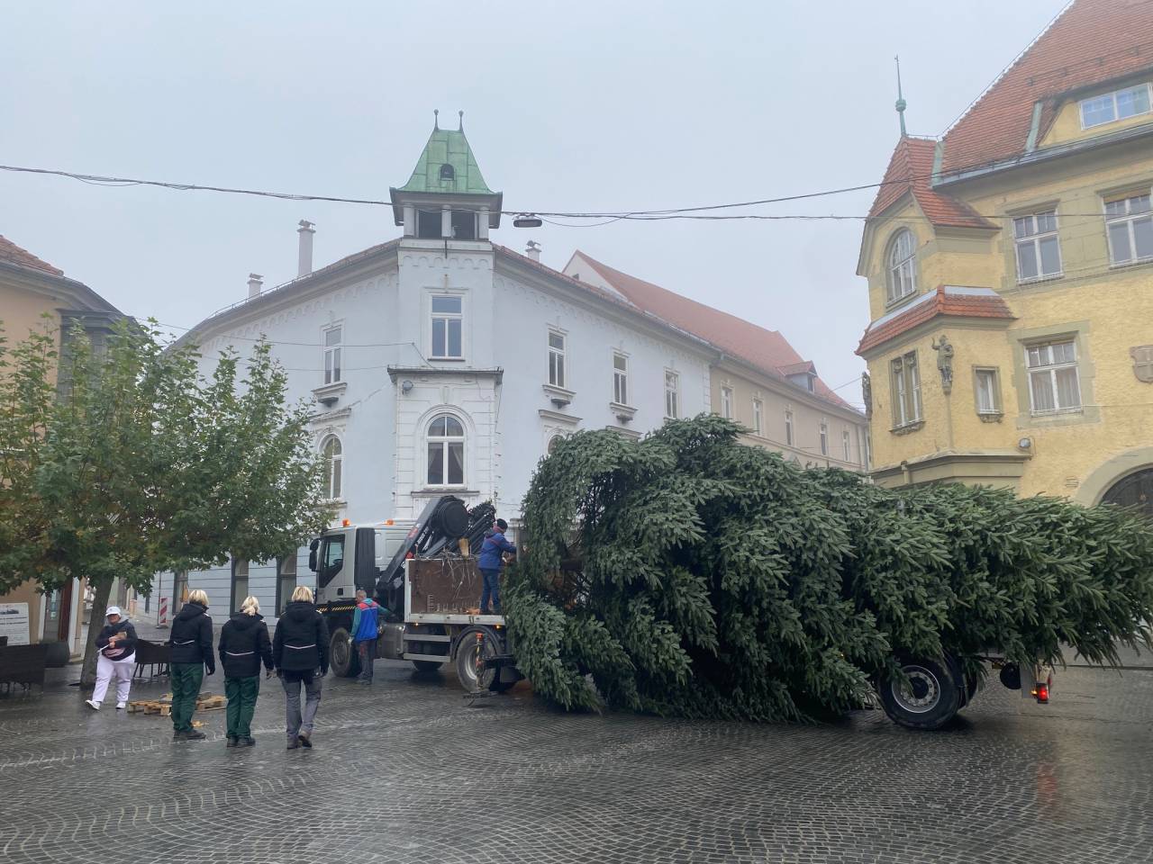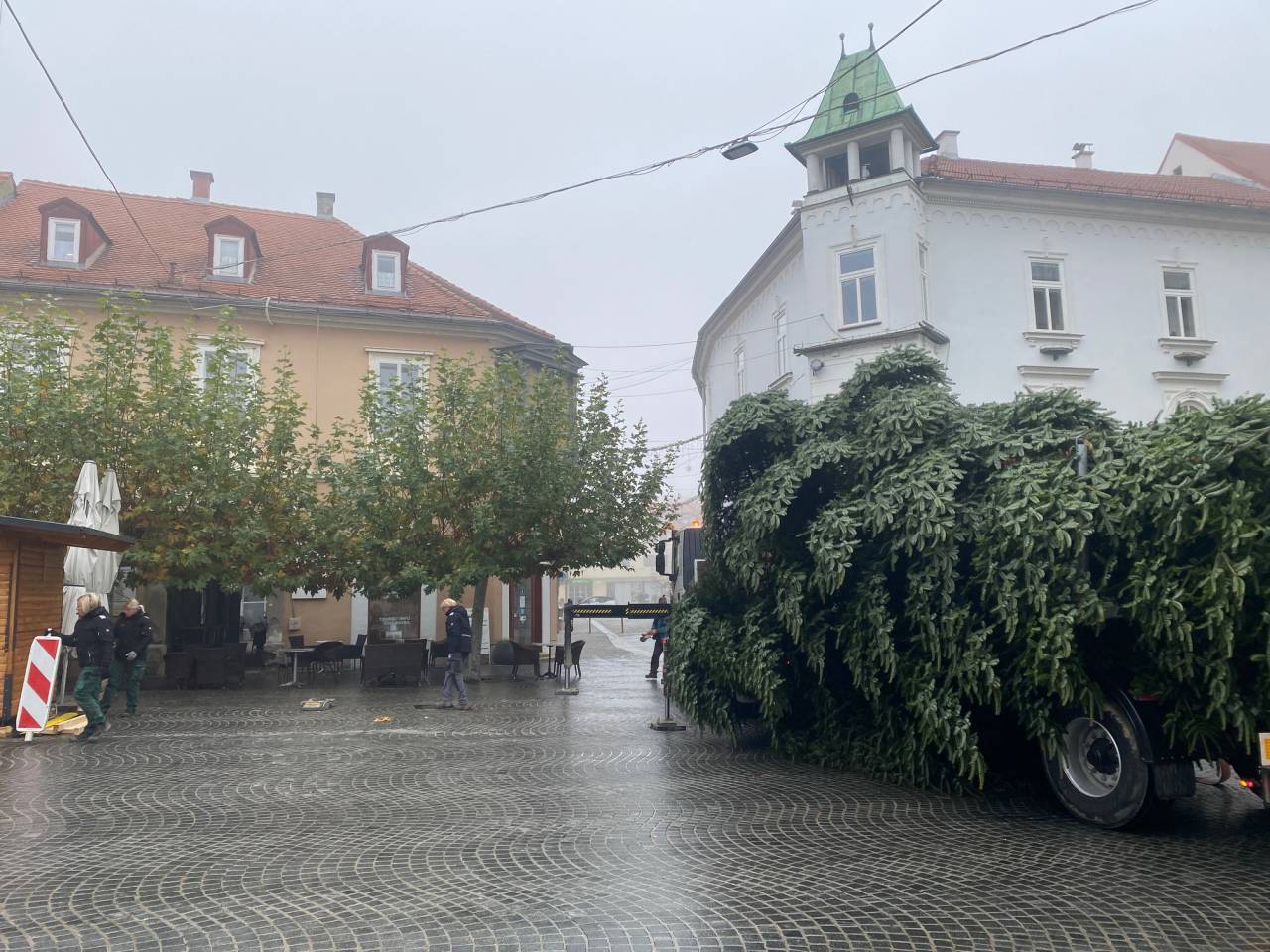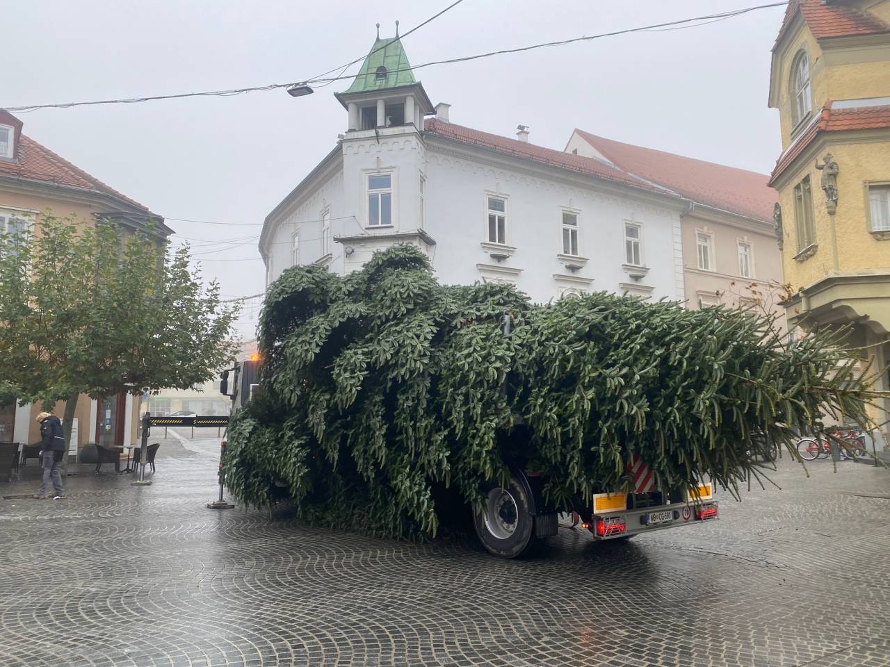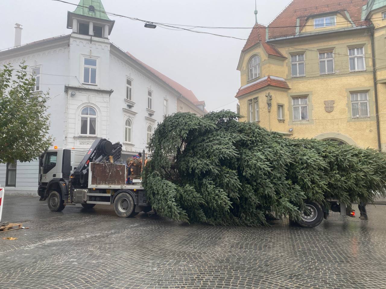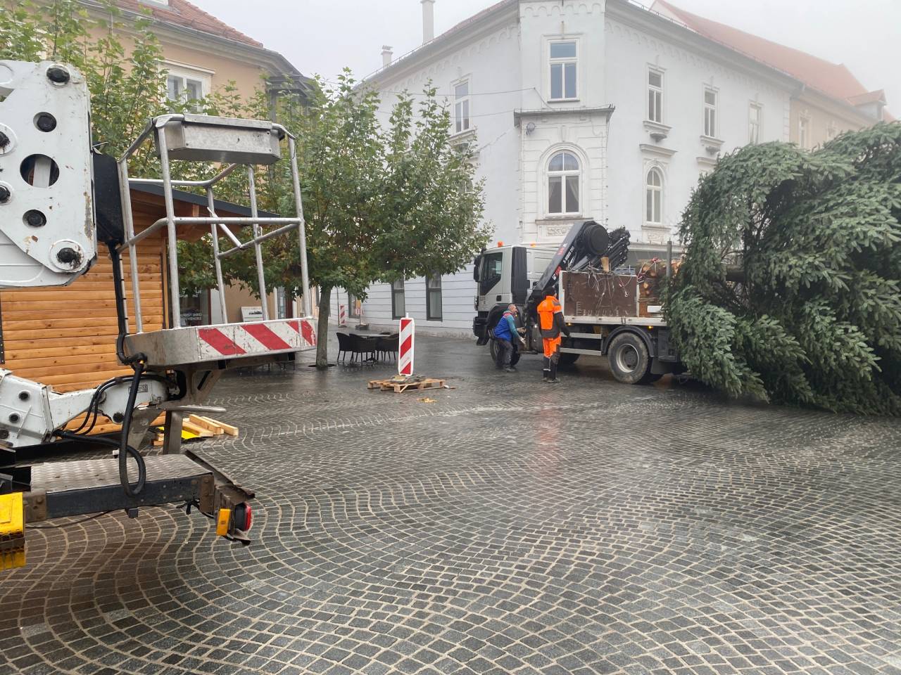 Delavci Javnih služb Ptuj nadaljujejo s pripravami na Advent na Ptuju. Danes so na Mestni trg pripeljali veliko smreko. Ta bo stala na svojem tradicionalnem mestu, pred Mestno hišo.