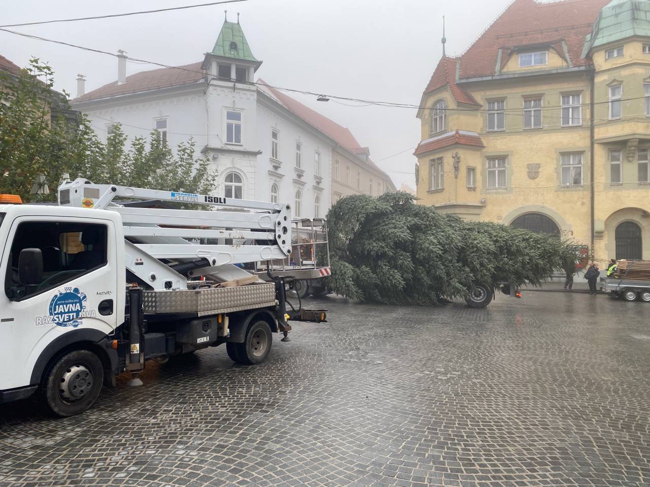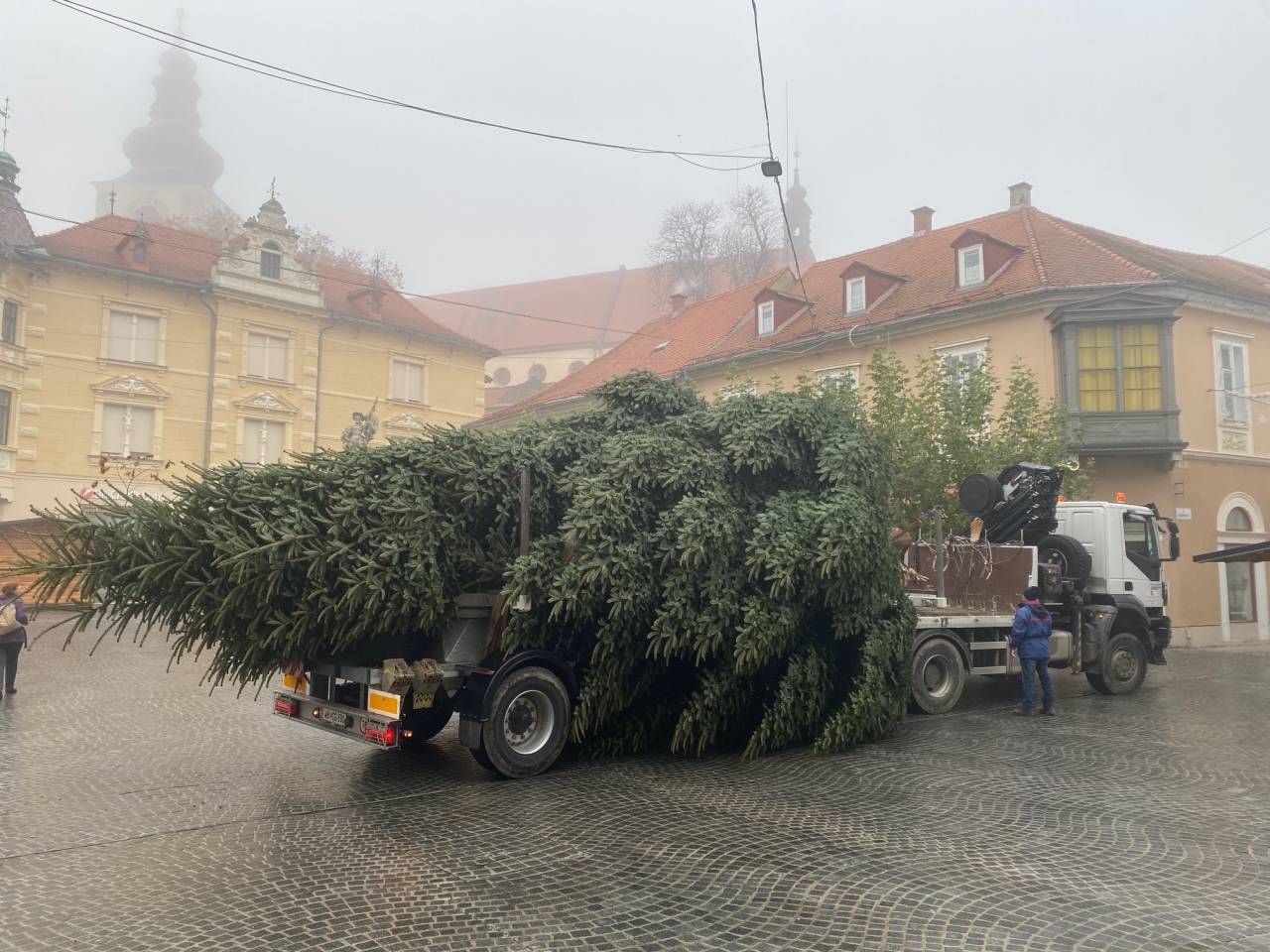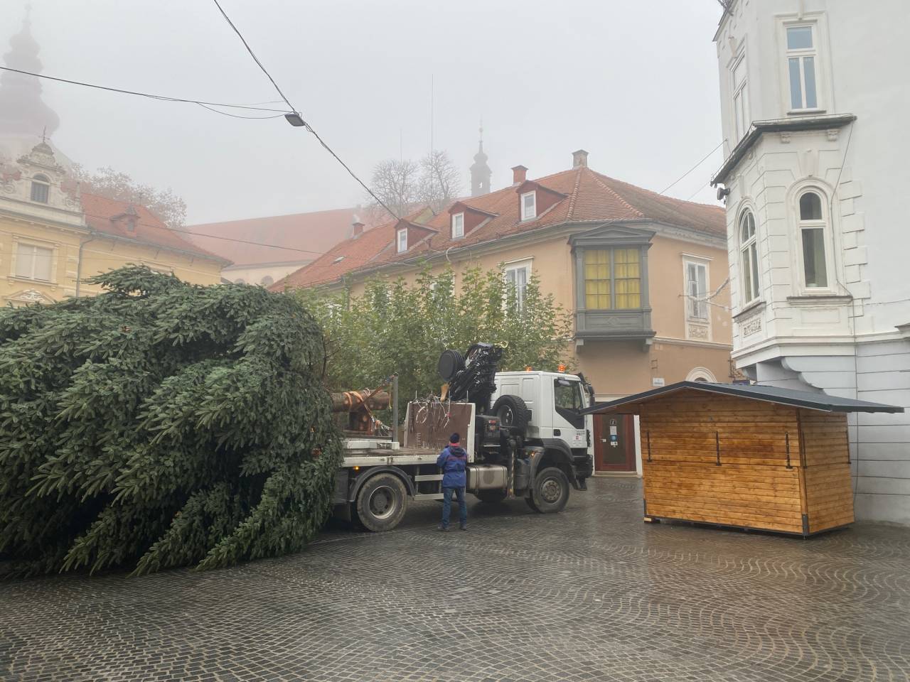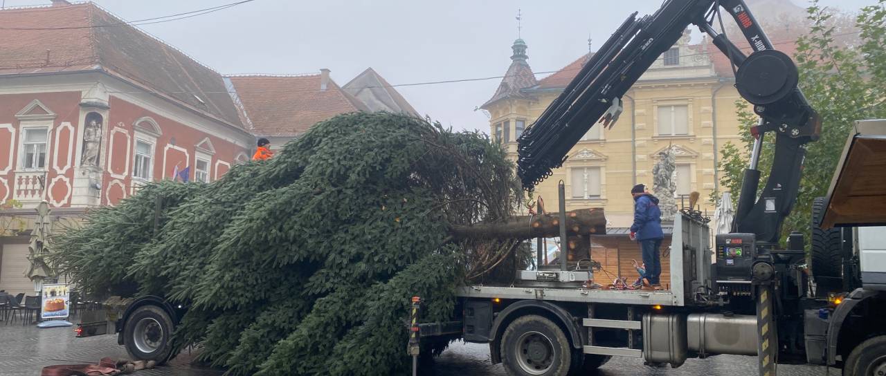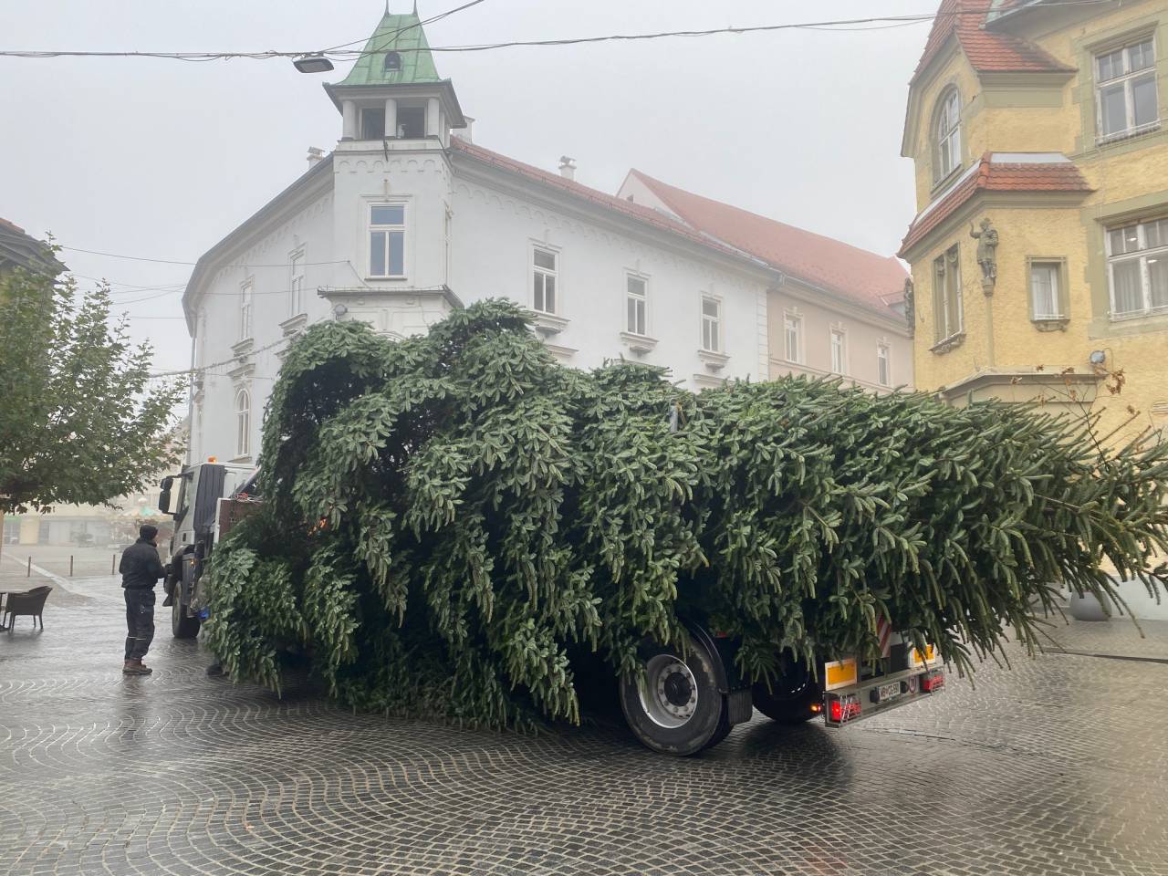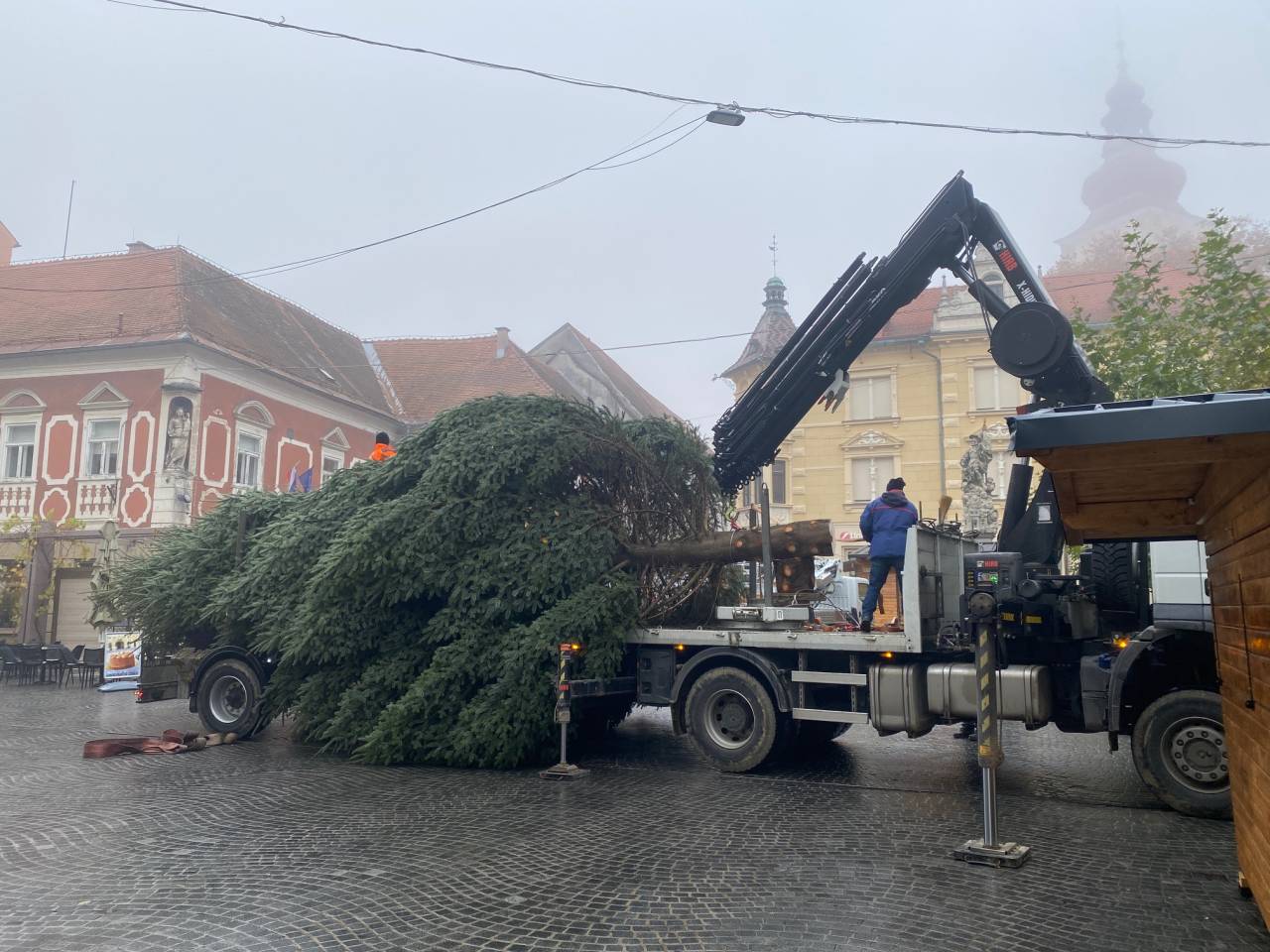 Delavci Javnih služb Ptuj nadaljujejo s pripravami na Advent na Ptuju. Danes so na Mestni trg pripeljali veliko smreko. Ta bo stala na svojem tradicionalnem mestu, pred Mestno hišo.
