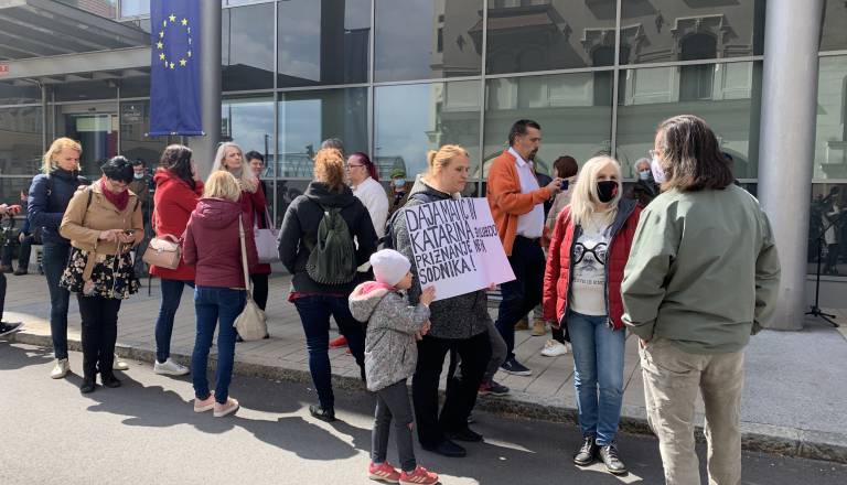 Tudi tokrat se je pred sodiščem zbrala množica ljudi, ki so s transparenti izrazili podporo tudi Maticu.