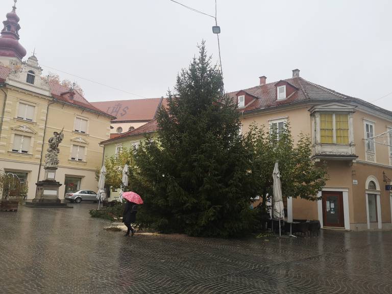 Prav danes, 8. novembra, pa so na ptujski Mestni trg pripeljali veliko, košato smrečico. Ta stoji na svojem tradicionalnem mestu, pred Mestno hišo.