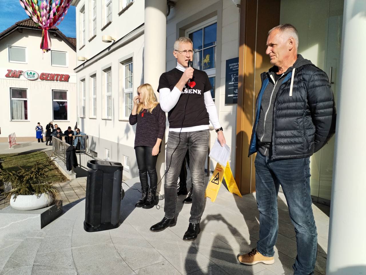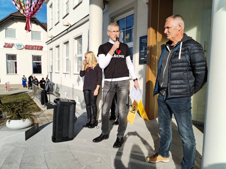 Kar nekaj protestnikov se je tako danes zbralo za občinsko stavbo v Markovcih, na drugi strani katere je istočasno potekala tudi županova prireditev.