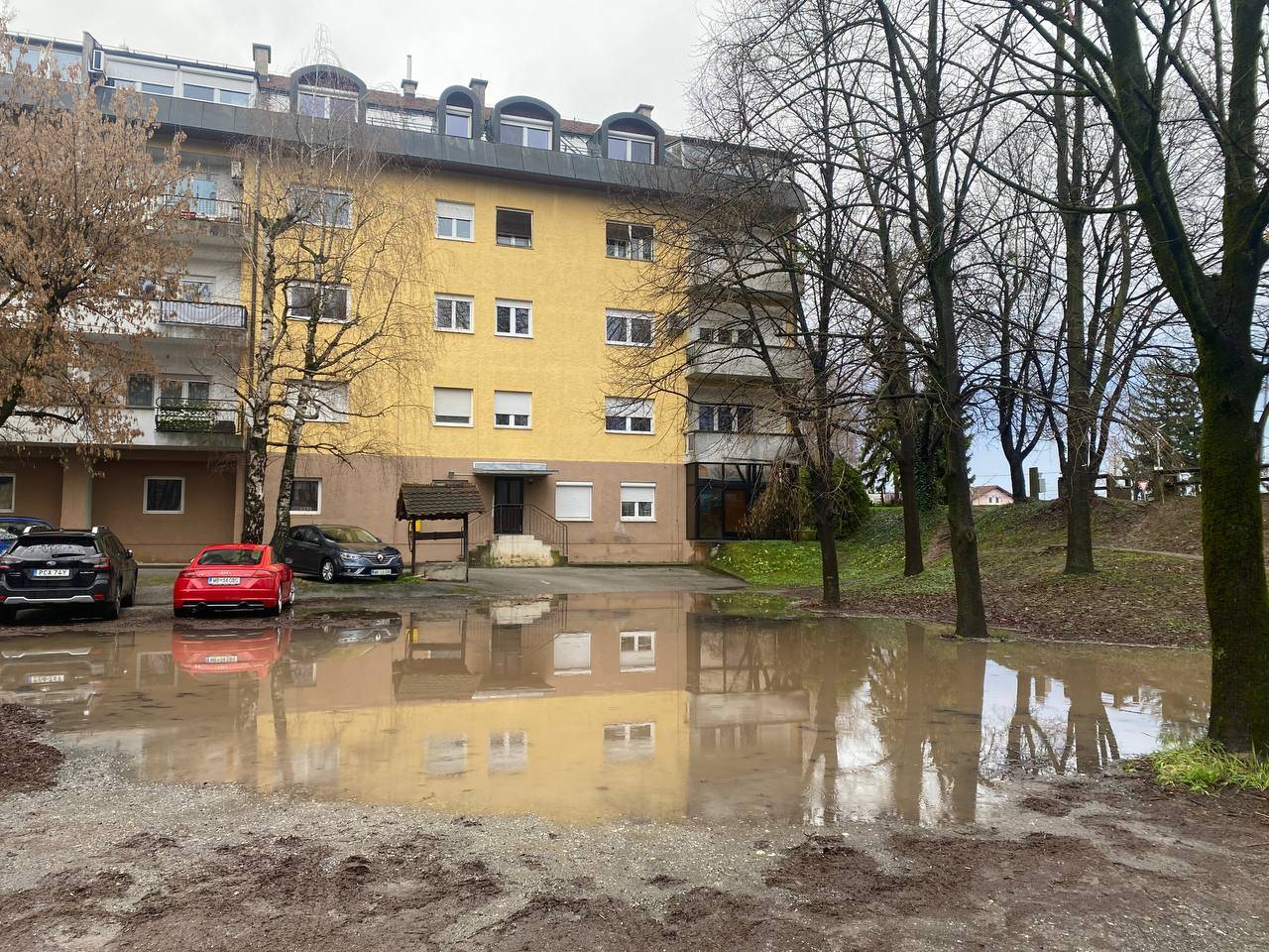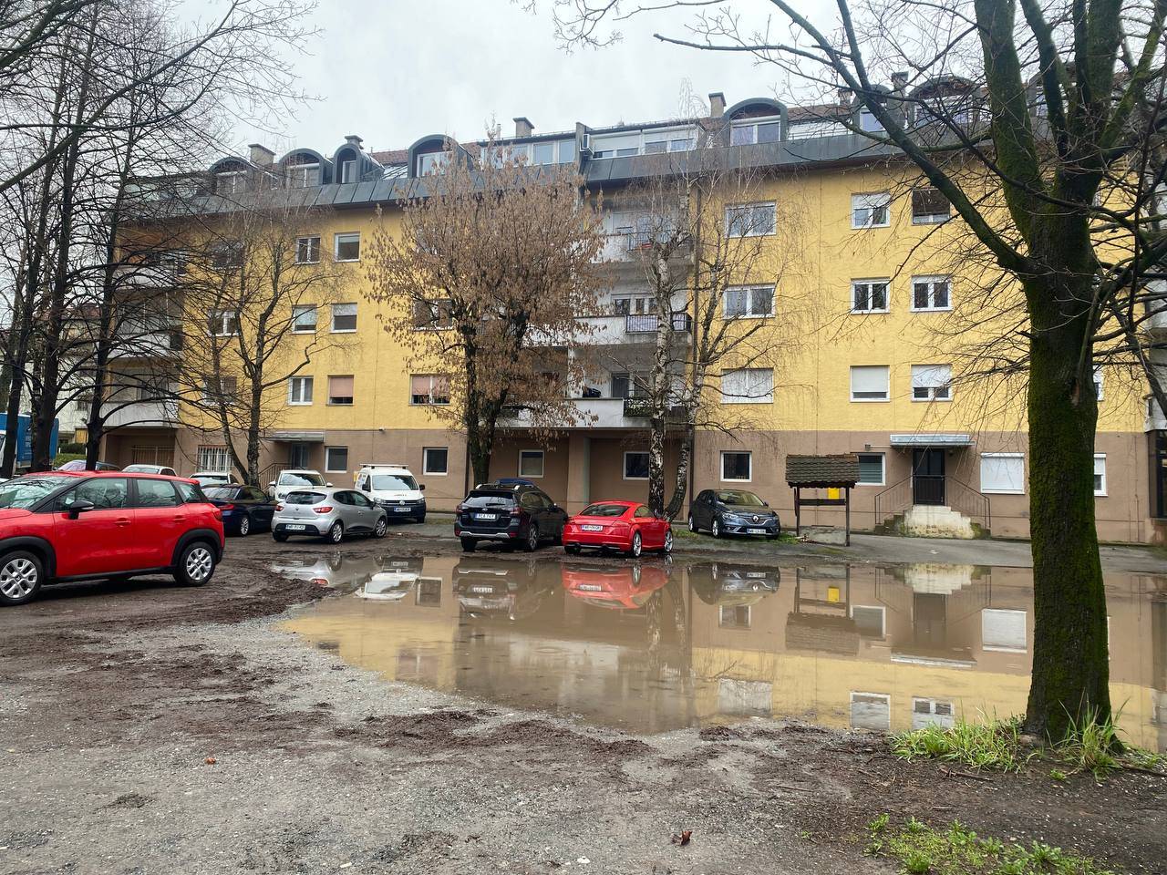 Na delu dvorišča, kjer parkirajo stanovalci, je bilo praktično nemogoče parkirati. Tisti, ki so tam parkirali pred dežjem in jim je zalilo avtomobile, pa so do njih težko dostopali.