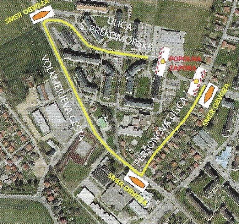Od 24. maja do 15. julija bo zapora od križišča s Peršonovo ulico do priključka pred parkiriščem Spar. Obvoz bo potekal po Peršonovi ulici in Volkmerjevi cesti na Ulico 5. prekomorske.