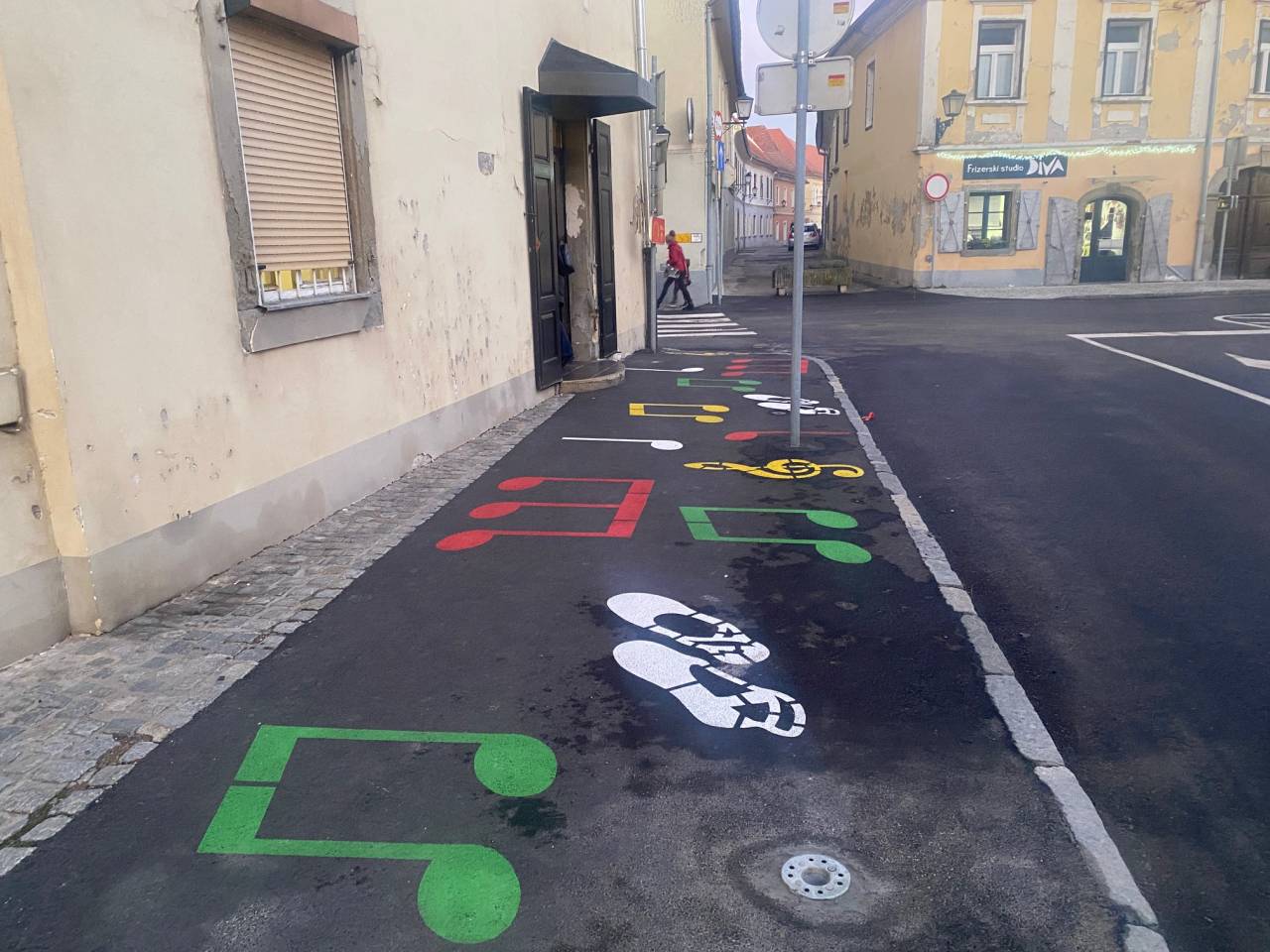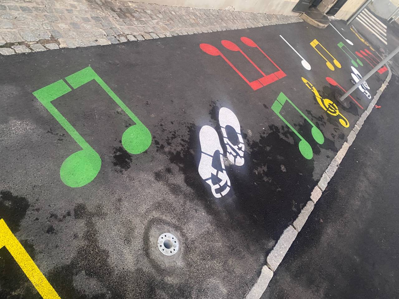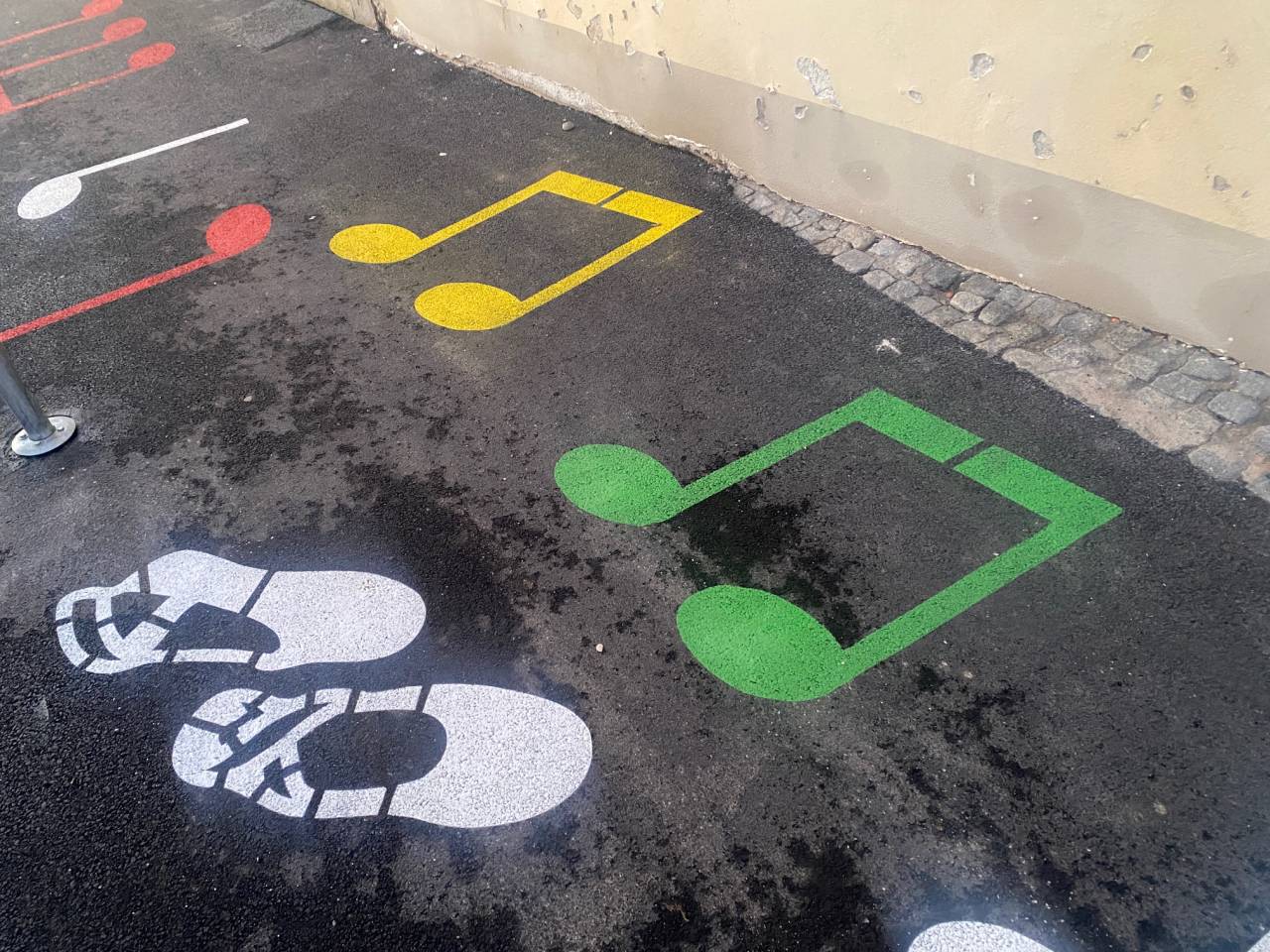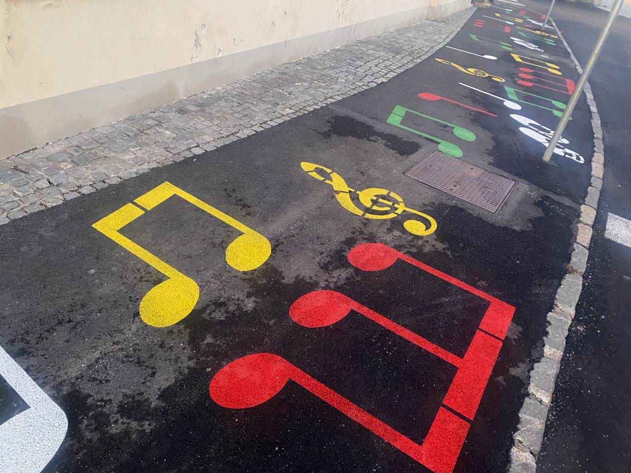 Po zaključku sanacije strehe so območje pred glasbeno šolo dodatno popestrili. Na pločnik so narisali glasbene note, kar ne le okrasi prostor, ampak tudi simbolično povezuje šolo z njenim glasbenim poslanstvom. Takšna ureditev prispeva k prijetnejšemu javnemu prostoru in obiskovalcem ustvarja bolj vabljivo in ustvarjalno vzdušje pred šolo.