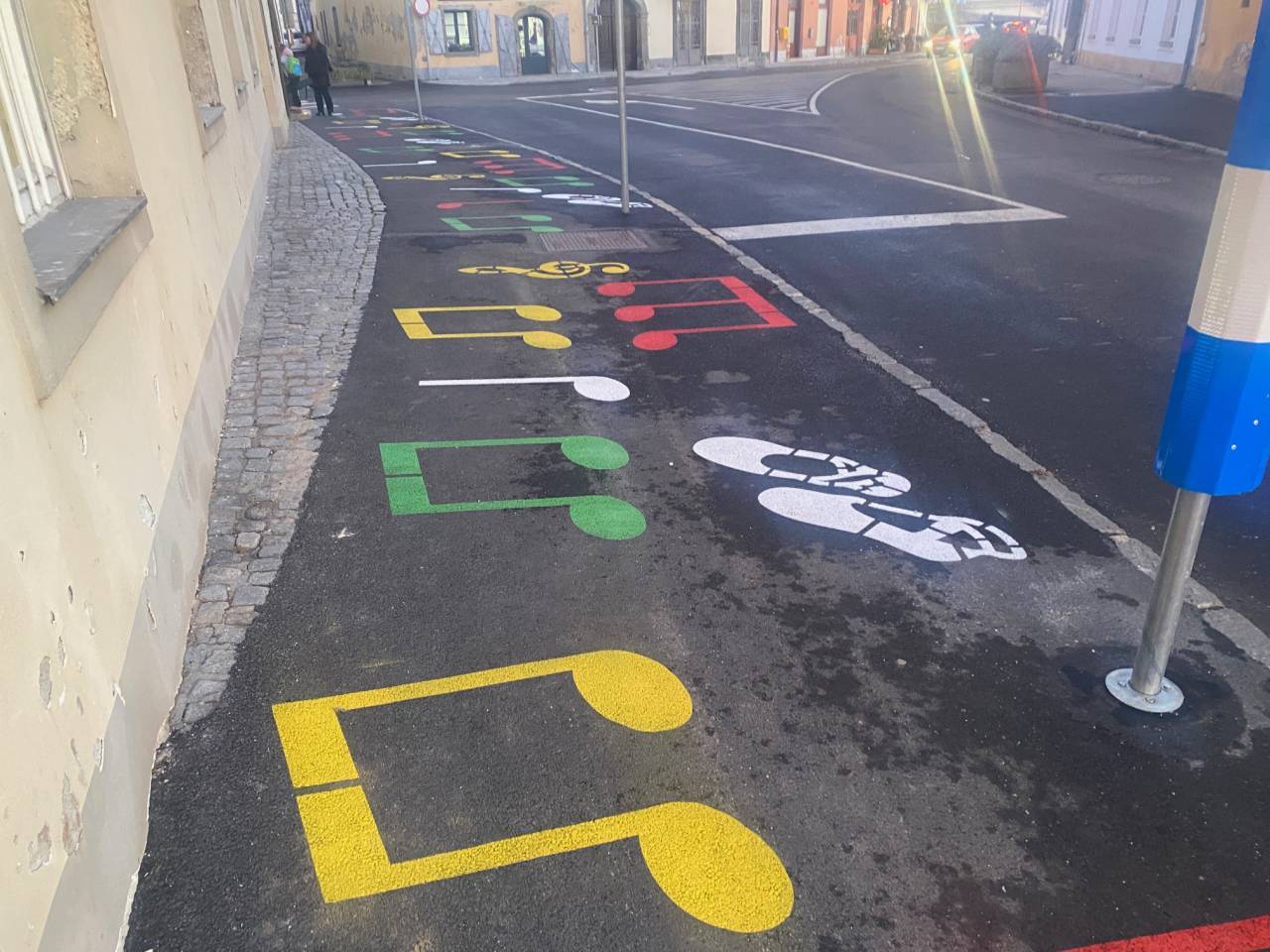 Območje pred glasbeno šolo na Ptuju so okrasili z glasbenimi notami, ki ustvarjajo prijetnejše vzdušje za obiskovalce.