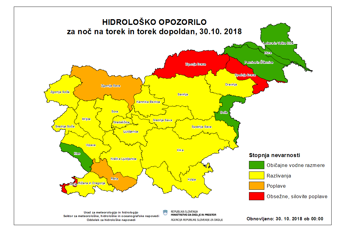 Skladno z napovedmi narašča pretok Drave, izdano je rdeče hidrološko opozorilo. Pretok reke Drave na meji z Avstrijo je trenutno 1406 kubičnih metrov na sekundo in bo v naslednjih urah pričel hitreje naraščati.