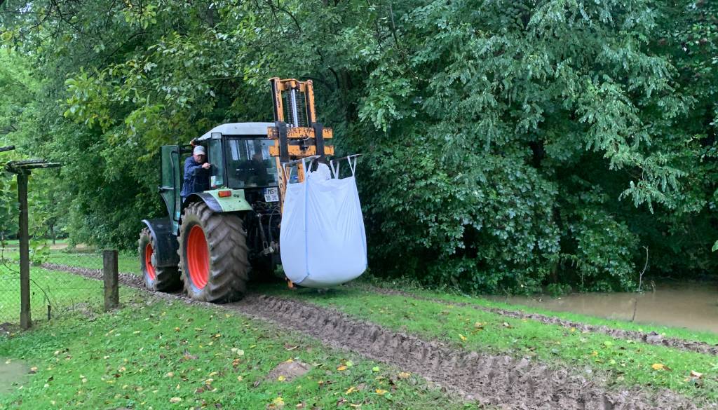 Mesto, kjer je reka predrla nasip, poskušajo zasipati s peskom in s tem vsaj omejiti iztekanje vode.