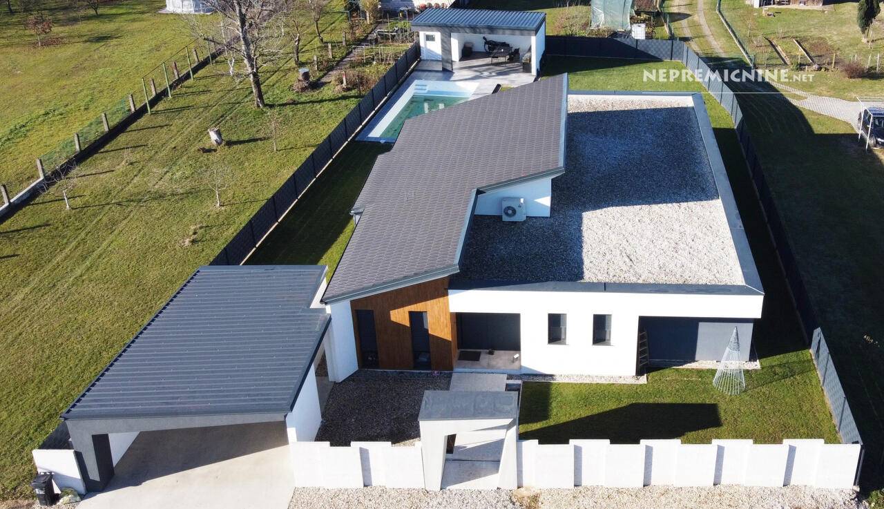 V Marjeti na Dravskem polju je naprodaj samostojna hiša z zunanjim bazenom, zgrajena leta 2022. Hiša ima razgibano obliko, ki je idealna za družino z otroki.
